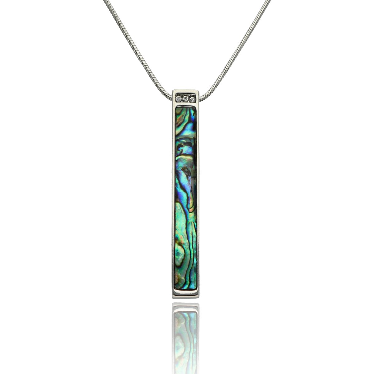 Elegancki, krótki naszyjnik wykonany z metalu antyalergicznego, ozdobiony efektowną zawieszką o długości ok. 5 cm. Zawieszka została wykonana z naturalnej muszli Abalonej, tworząc harmonijne, przyciągające uwagę połączenie.