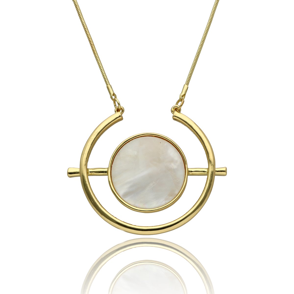 Elegancki, krótki naszyjnik wykonany z metalu antyalergicznego, ozdobiony efektowną zawieszką o długości ok. 5 cm. Zawieszka została wykonana z naturalnej muszli mlecznej, tworząc harmonijne, przyciągające uwagę połączenie.