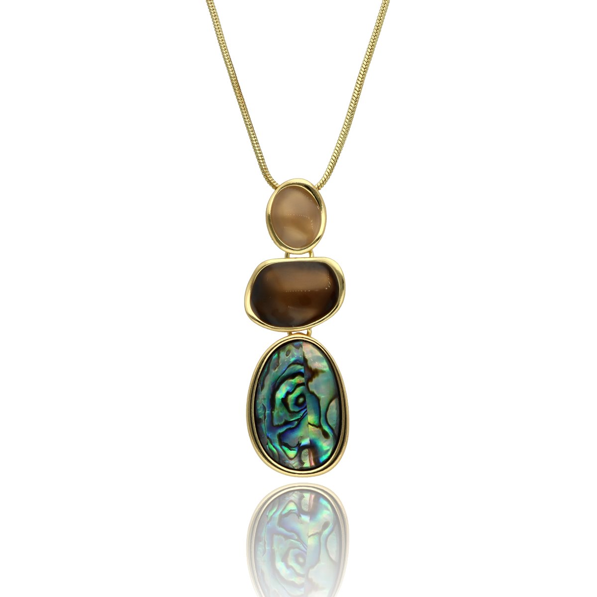 Długi, wysmuklający sylwetkę naszyjnik, wykonany z żywicy, emalii i muszli naturalnej – długość 45 cm + 8 cm regulacji. Ozoba ma 6,5 cm długości.