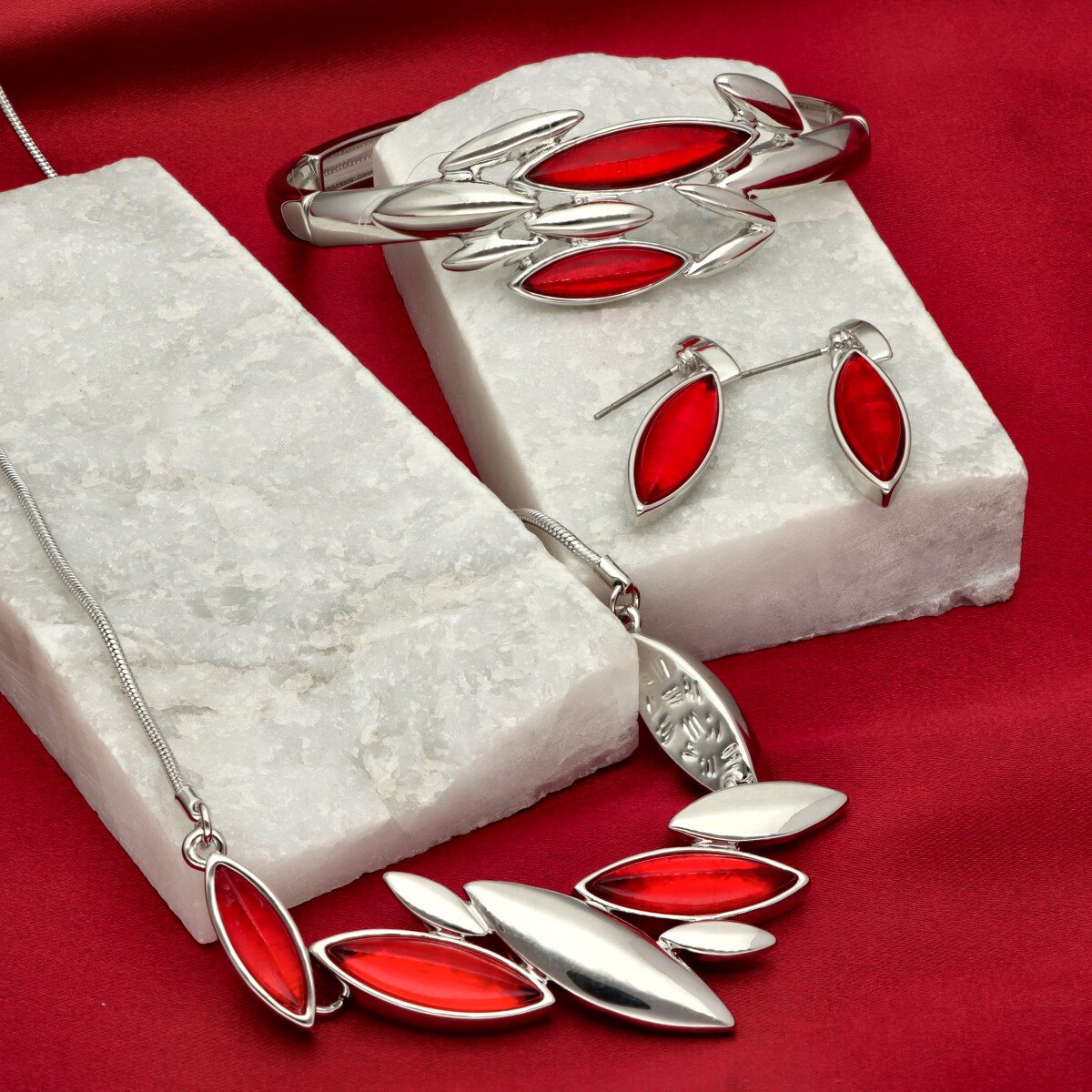 Uroczy, dekoltowy naszyjnik wykonany z antyalergicznego metalu i kolorowej żywicy z efektem głębi. Długość 45 cm + 8 cm regulacja. Szukaj do kompletu bransoletki i kolczyków o tym samym indeksie numerycznym.