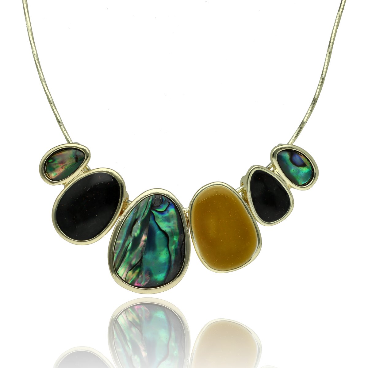 Opis produktu: Naszyjnik o długości 42 cm + 8 cm przedłużki, z ozdobnym elementem o szerokości w najszerszym miejscu ok. 2,5 cm. Kompozycja nieregularnych form tworzy harmonijną, artystyczną całość, która przyciąga spojrzenie i nadaje biżuterii wyrafinowanego charakteru. Naszyjnik wykonany z hipoalergicznego metalu (zamak – stop cynku, bezpieczny dla wrażliwej skóry), ozdobiony naturalną muszlą, kolorową emalią oraz żywicą z efektem głębi. Powierzchnia muszli subtelnie mieni się w świetle, tworząc elegancki efekt inspirowany opalem, a całość prezentuje się wyjątkowo szlachetnie. Do kompletu szukaj pasującej bransoletki i kolczyków o tym samym indeksie numerycznym.
