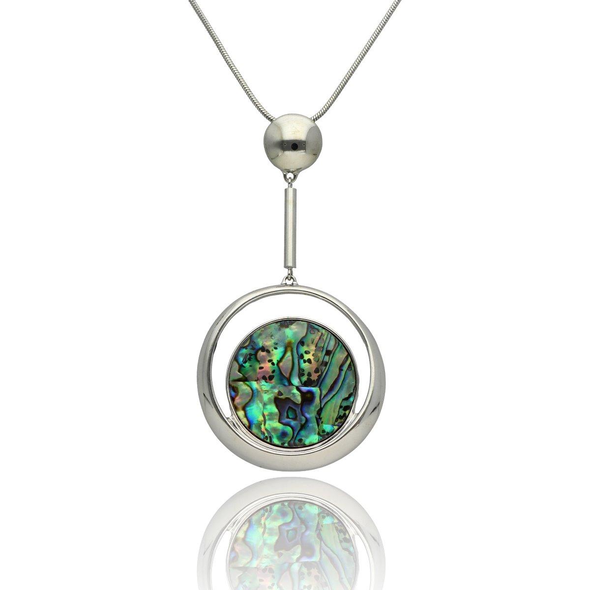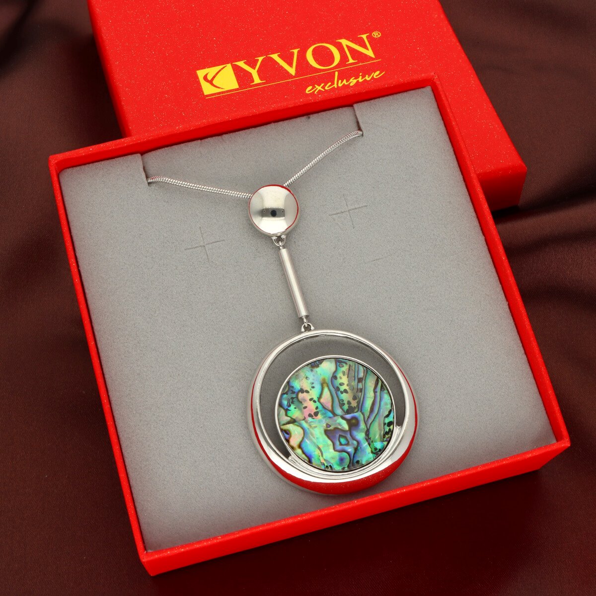 Elegancki, krótki naszyjnik wykonany z metalu antyalergicznego, ozdobiony efektowną zawieszką o długości ok. 5 cm. Zawieszka została wykonana z naturalnej muszli Abalonej, tworząc harmonijne, przyciągające uwagę połączenie.