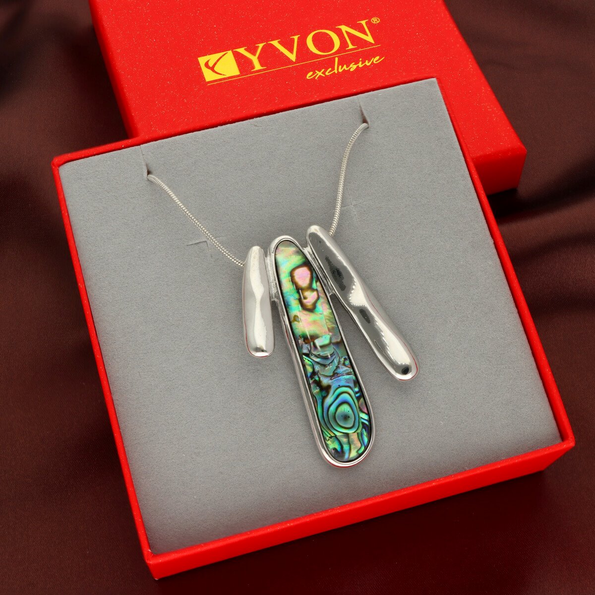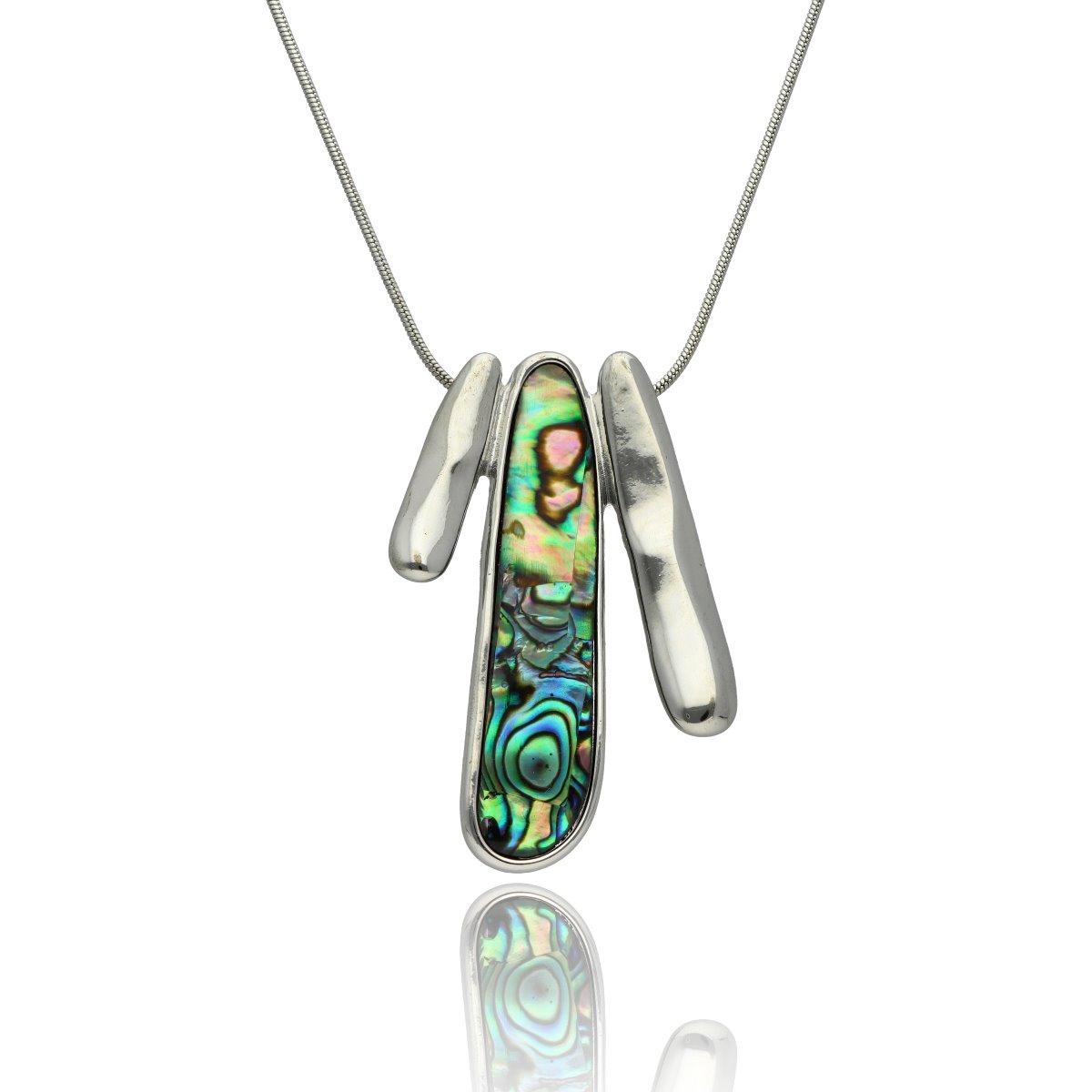 Elegancki, krótki naszyjnik wykonany z metalu antyalergicznego, ozdobiony efektowną zawieszką o długości ok. 5 cm. Zawieszka została wykonana z naturalnej muszli Abalonej, tworząc harmonijne, przyciągające uwagę połączenie.