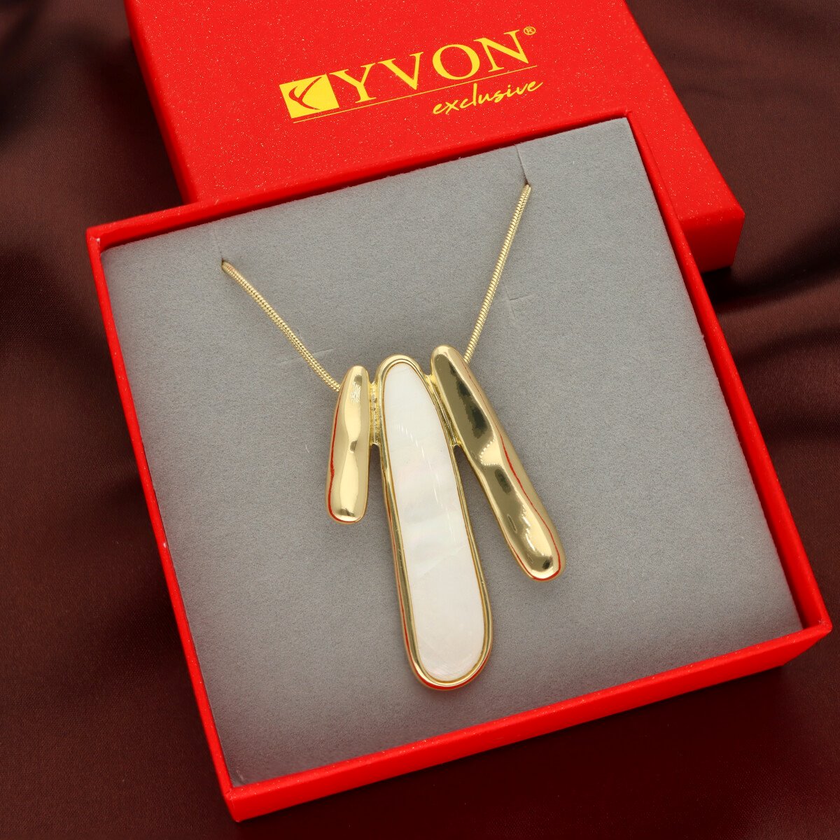 Elegancki, krótki naszyjnik wykonany z metalu antyalergicznego, ozdobiony efektowną zawieszką o długości ok. 5 cm. Zawieszka została wykonana z naturalnej muszli mlecznej, tworząc harmonijne, przyciągające uwagę połączenie.