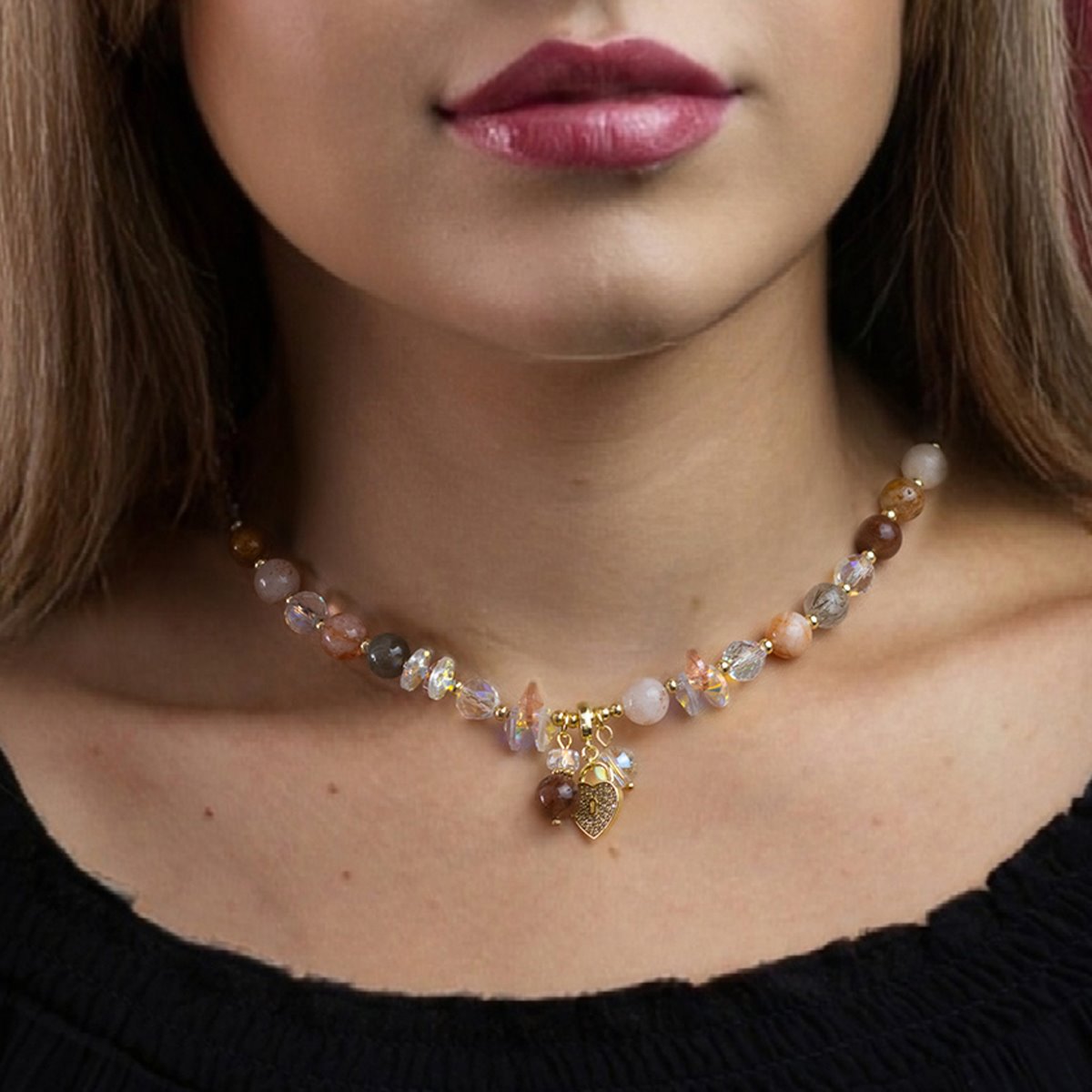 Ekskluzywny naszyjnik z kolekcji LOVELY STONES wykonany z najwyższej jakości mosiądzu oraz kwarcu rutylowego i kryształu górskiego. Długość: 42 cm + regulacja.