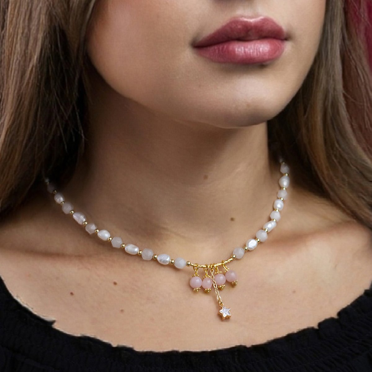 Ekskluzywny naszyjnik z kolekcji LOVELY STONES wykonany z najwyższej jakości mosiądzu oraz pereł naturalnych, kwarcu, cyrkonii. Długość: 42 cm + regulacja.
