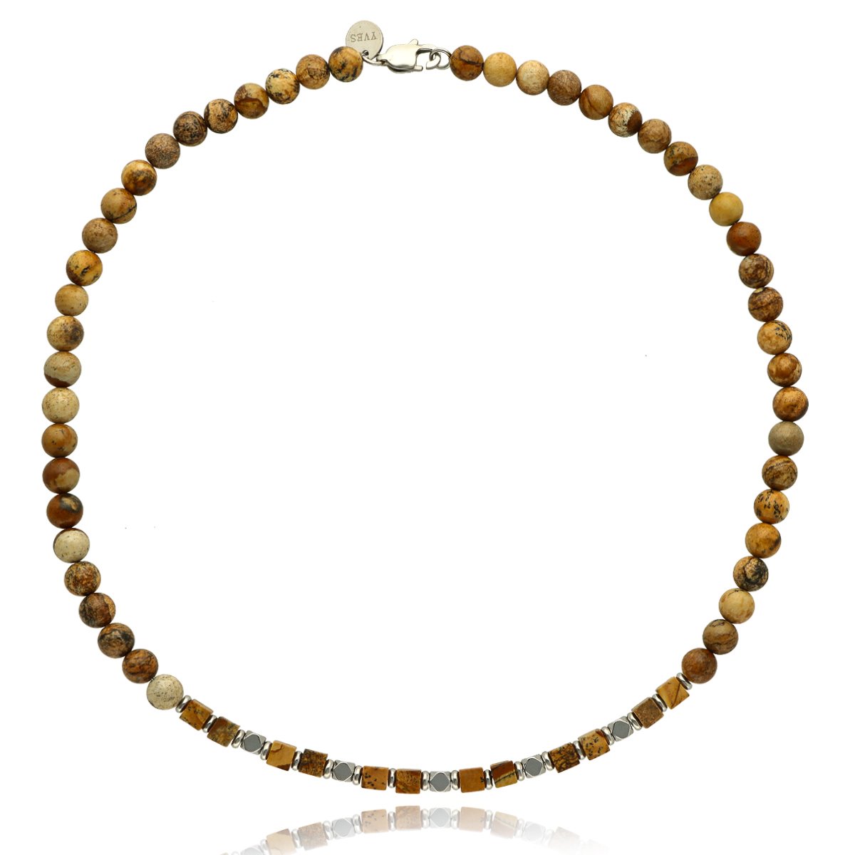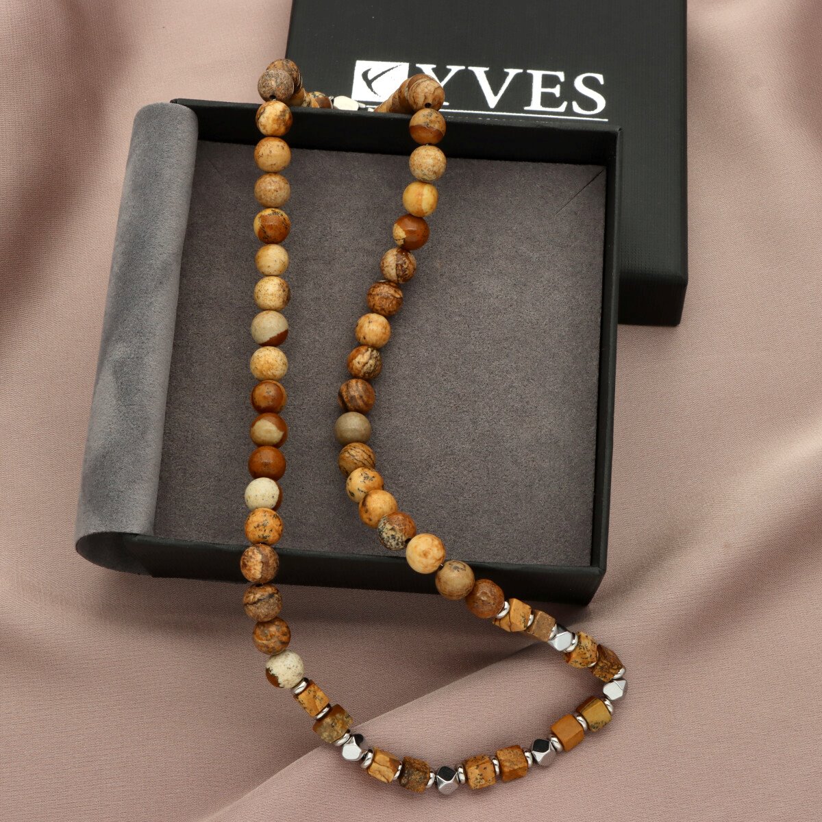 Naszyjnik męski YVES wykonany ze stali szlachetnej i naturalnych kamieni – jaspisu obrazkowego. Długość 45 cm, wykończony w sposób gwarantujący wygodę codziennego noszenia. Stal 316L jest w pełni antyalergiczna, odporna na zarysowania i utratę koloru. Naszyjnik zapakowany w eleganckie pudełko, idealny na prezent. Model doskonale komponuje się z bransoletą o tym samym indeksie.