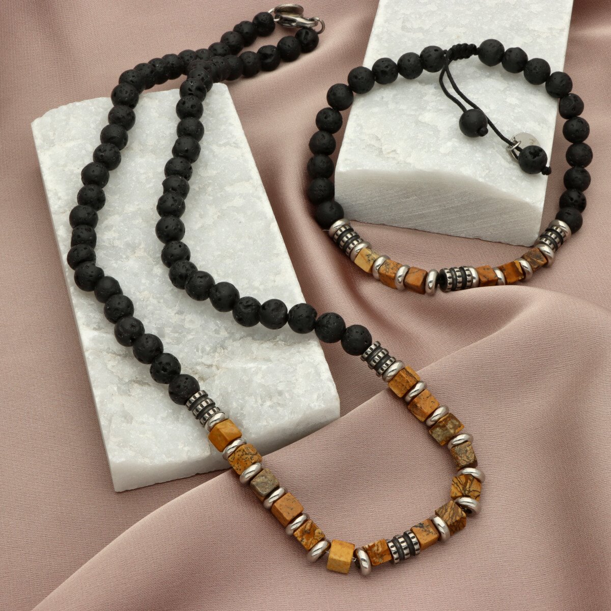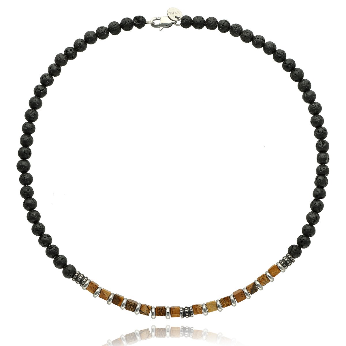 Naszyjnik męski YVES wykonany ze stali szlachetnej i naturalnych kamieni – jaspisu obrazkoweo i kamienia lawa. Długość 45 cm, wykończony w sposób gwarantujący wygodę codziennego noszenia. Stal 316L jest w pełni hypoalergiczna, odporna na zarysowania i utratę koloru. Naszyjnik zapakowany w eleganckie pudełko, idealny na prezent. Model doskonale komponuje się z bransoletą o tym samym indeksie.