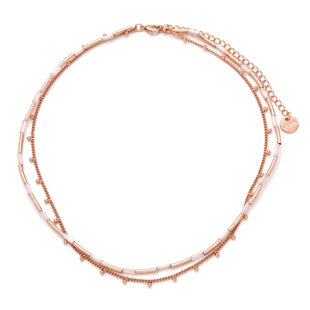 Naszyjnik wykonany z mosiądzu pozłacanego różowym złotem, ozdobiony elementami z naturalnej muszli. Subtelne połączenie łańcuszka z gładkimi, połyskującymi segmentami nadaje mu elegancki i nowoczesny charakter. Długość naszyjnika wynosi 42 cm z możliwością regulacji o dodatkowe 8 cm, co pozwala idealnie dopasować go do różnych stylizacji. Hipoalergiczny materiał gwarantuje komfort noszenia. Do kompletu dostępna jest bransoletka o tym samym indeksie numerycznym.
