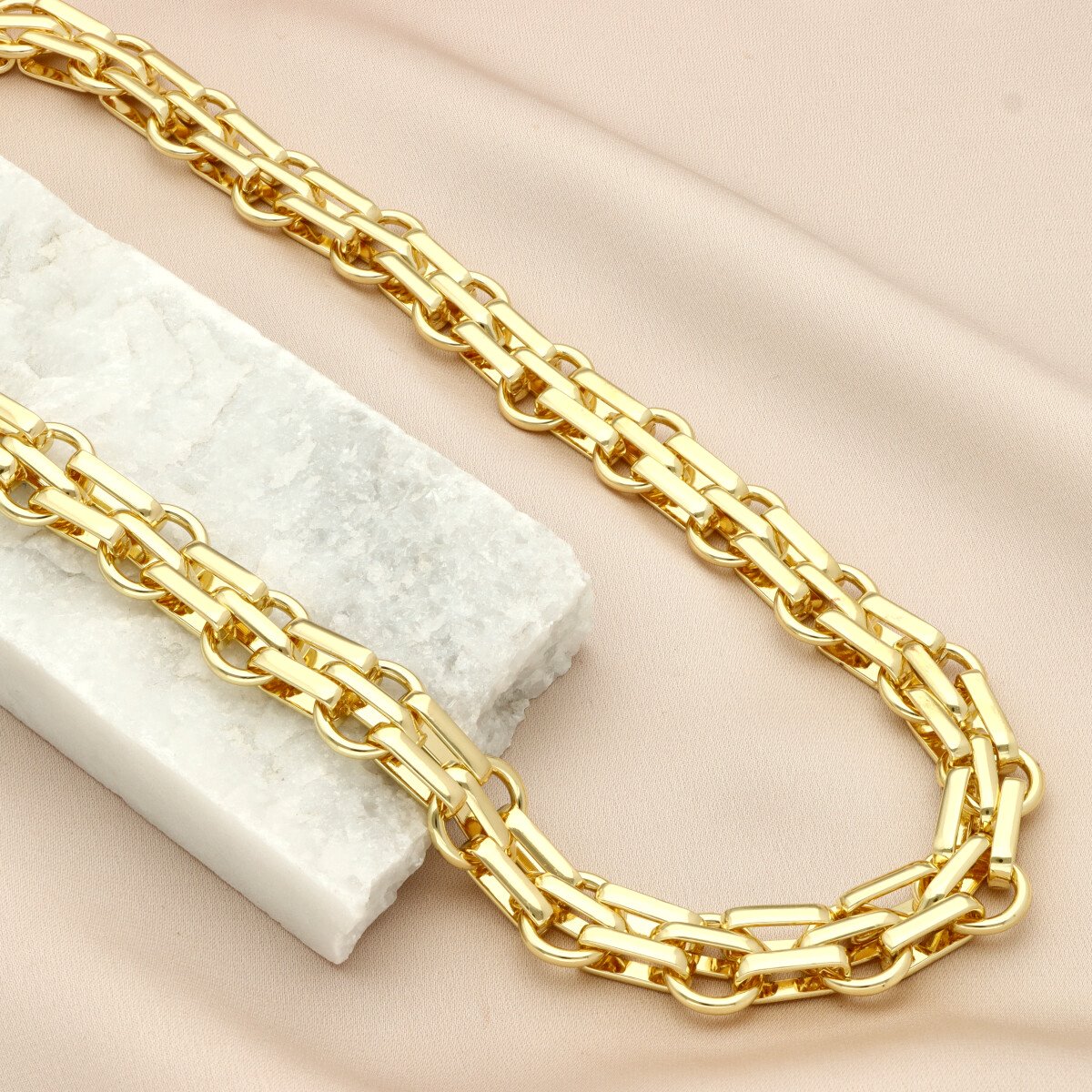 Opis produktu: Efektowny naszyjnik o nowoczesnym, wyrazistym charakterze, wykonany z wysokiej jakości hipoalergicznego metalu (zamak – stop cynku), zapewniającego komfort noszenia oraz trwałość. Model wyróżnia się eleganckim wykończeniem w modnym odcieniu light gold – jasnego, subtelnego złota inspirowanego włoskim stylem biżuterii. To właśnie ten odcień nadaje całości luksusowego, ale jednocześnie bardzo świeżego i współczesnego wyglądu. Tego typu złoto jest obecnie jednym z najmocniejszych trendów – jaśniejsze, bardziej „soft” niż klasyczne żółte złoto. Wyraziste ogniwa tworzą spójną, elegancką formę, która przyciąga uwagę i pięknie układa się na szyi. Naszyjnik doskonale sprawdzi się zarówno w codziennych stylizacjach, jak i w bardziej eleganckich zestawieniach. Do naszyjnika przewidziana jest pasująca bransoletka o tym samym indeksie, tworząca spójny komplet. Długość naszyjnika: 44 cm Materiał: metal hipoalergiczny (zamak)