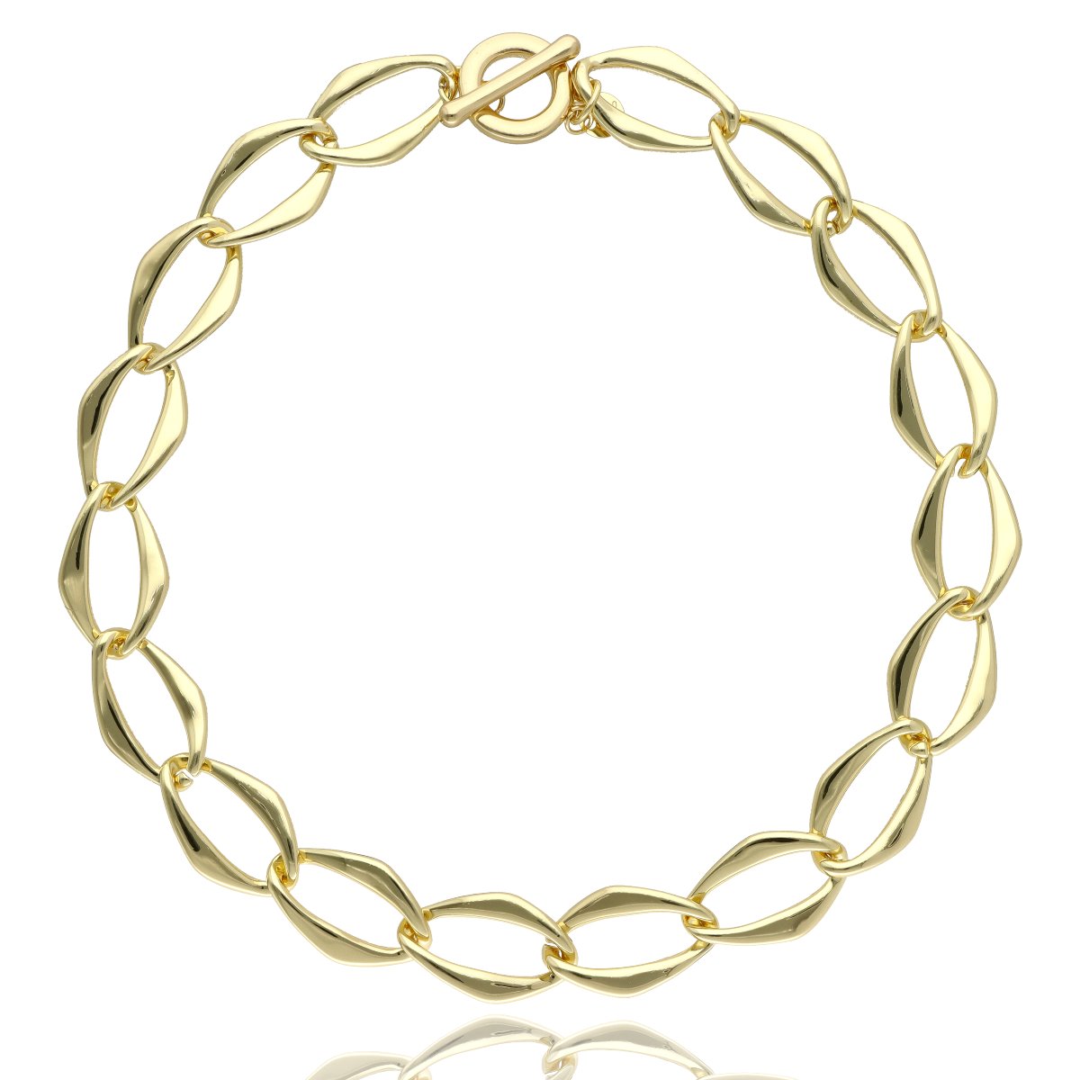Opis produktu: Efektowny naszyjnik o nowoczesnym, wyrazistym charakterze, wykonany z wysokiej jakości hipoalergicznego metalu (zamak – stop cynku), zapewniającego komfort noszenia oraz trwałość. Model wyróżnia się eleganckim wykończeniem w modnym odcieniu light gold – jasnego, subtelnego złota inspirowanego włoskim stylem biżuterii. To właśnie ten odcień nadaje całości luksusowego, ale jednocześnie bardzo świeżego i współczesnego wyglądu. Tego typu złoto jest obecnie jednym z najmocniejszych trendów – jaśniejsze, bardziej „soft” niż klasyczne żółte złoto. Wyraziste ogniwa tworzą spójną, elegancką formę, która przyciąga uwagę i pięknie układa się na szyi. Naszyjnik doskonale sprawdzi się zarówno w codziennych stylizacjach, jak i w bardziej eleganckich zestawieniach. Do naszyjnika przewidziana jest pasująca bransoletka o tym samym indeksie, tworząca spójny komplet. Długość naszyjnika: 44 cm Materiał: metal hipoalergiczny (zamak)