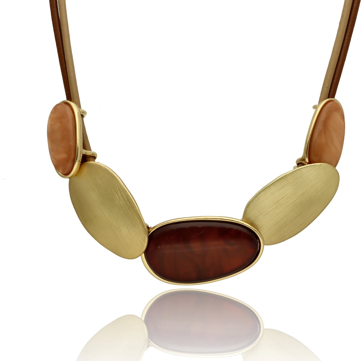 Eleganski dekoltowy naszyjnik, wykonany z żywicy i skóry naturalnej. Długość 45 cm + 8 cm regulacji.