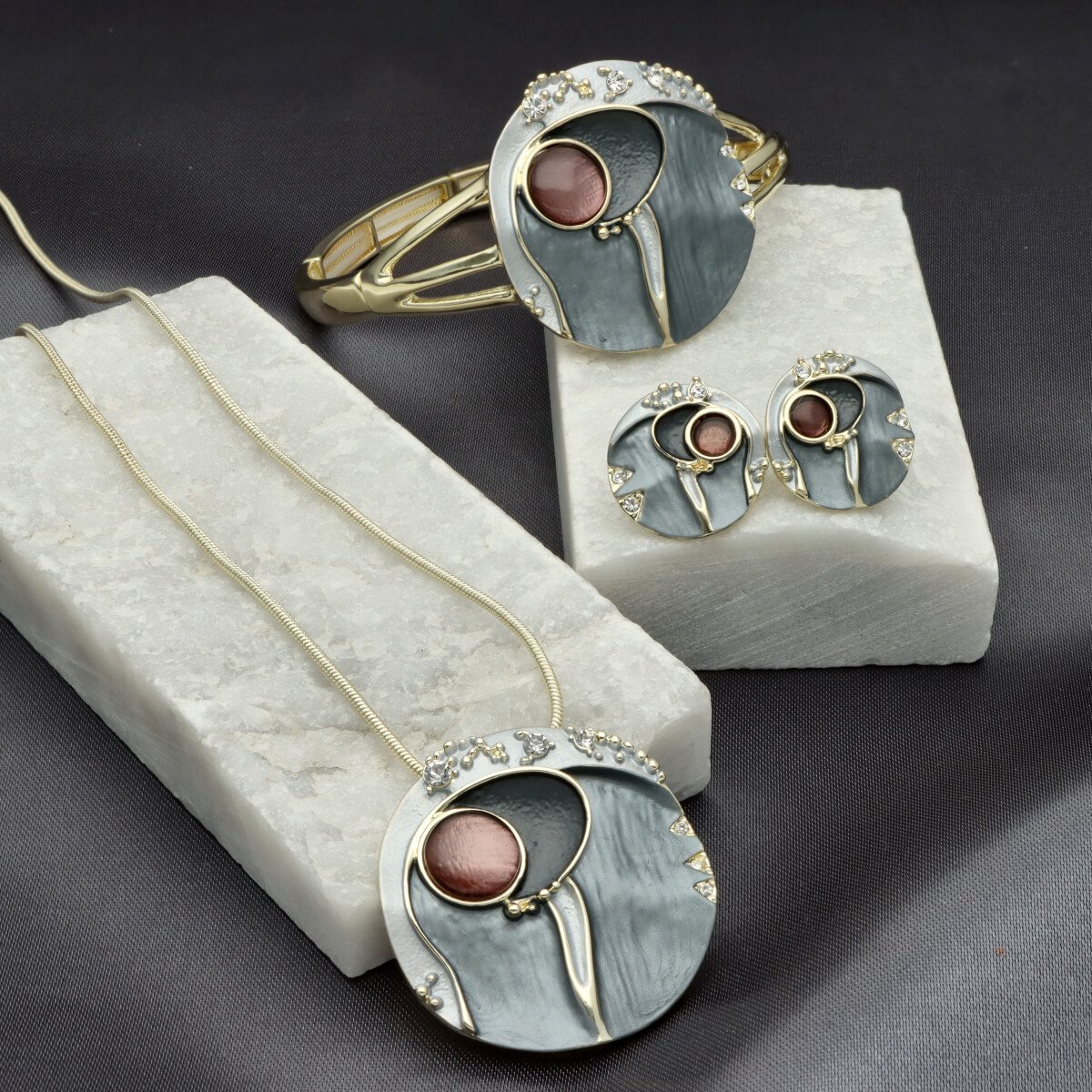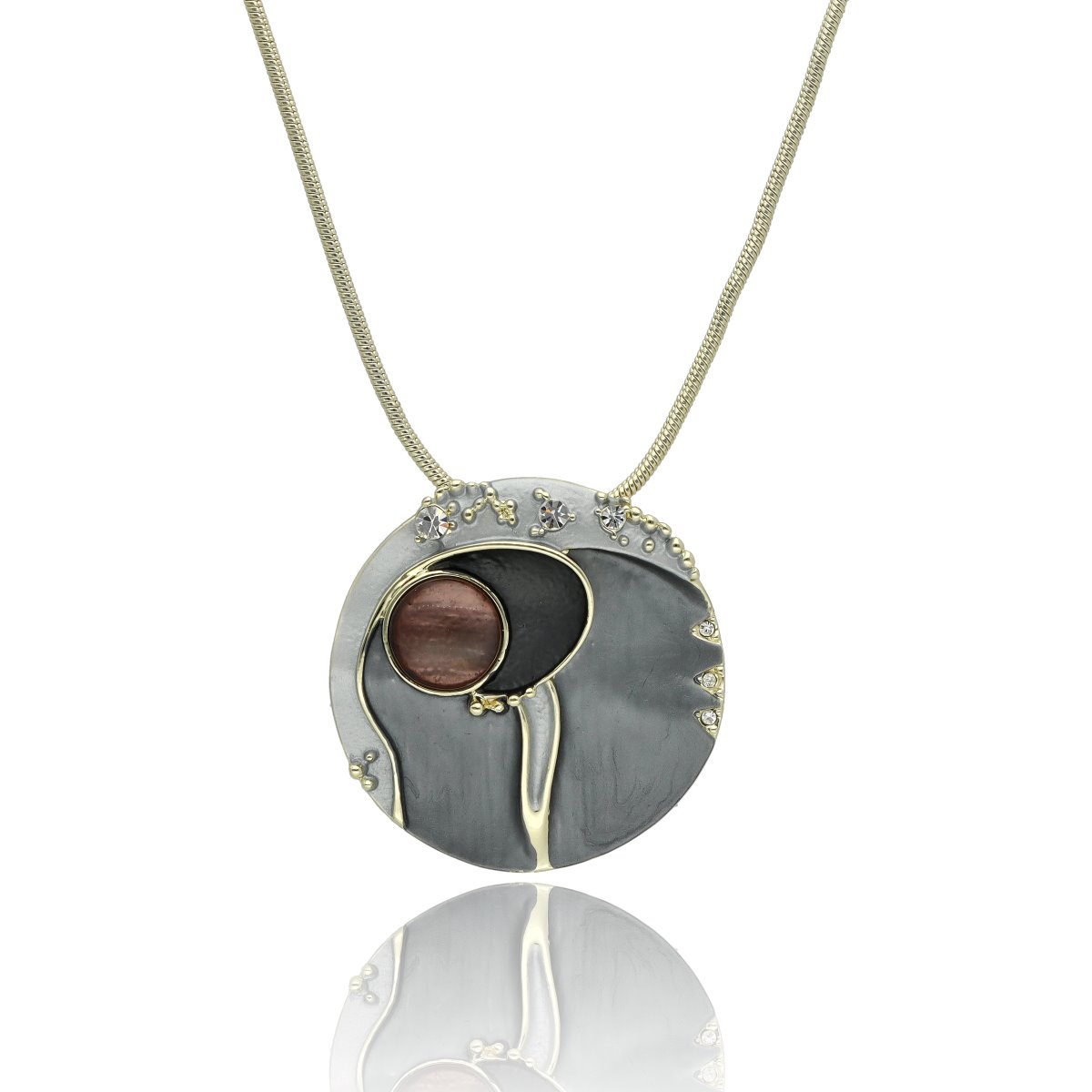 Uroczy, dekoltowy naszyjnik wykonany z antyalergicznego metalu, żywicy jubilerskiej i emalii. Długość 45 cm + 8 cm regulacja. Szukaj do kompletu bransoletki i kolczyków o tym samym indeksie numerycznym.