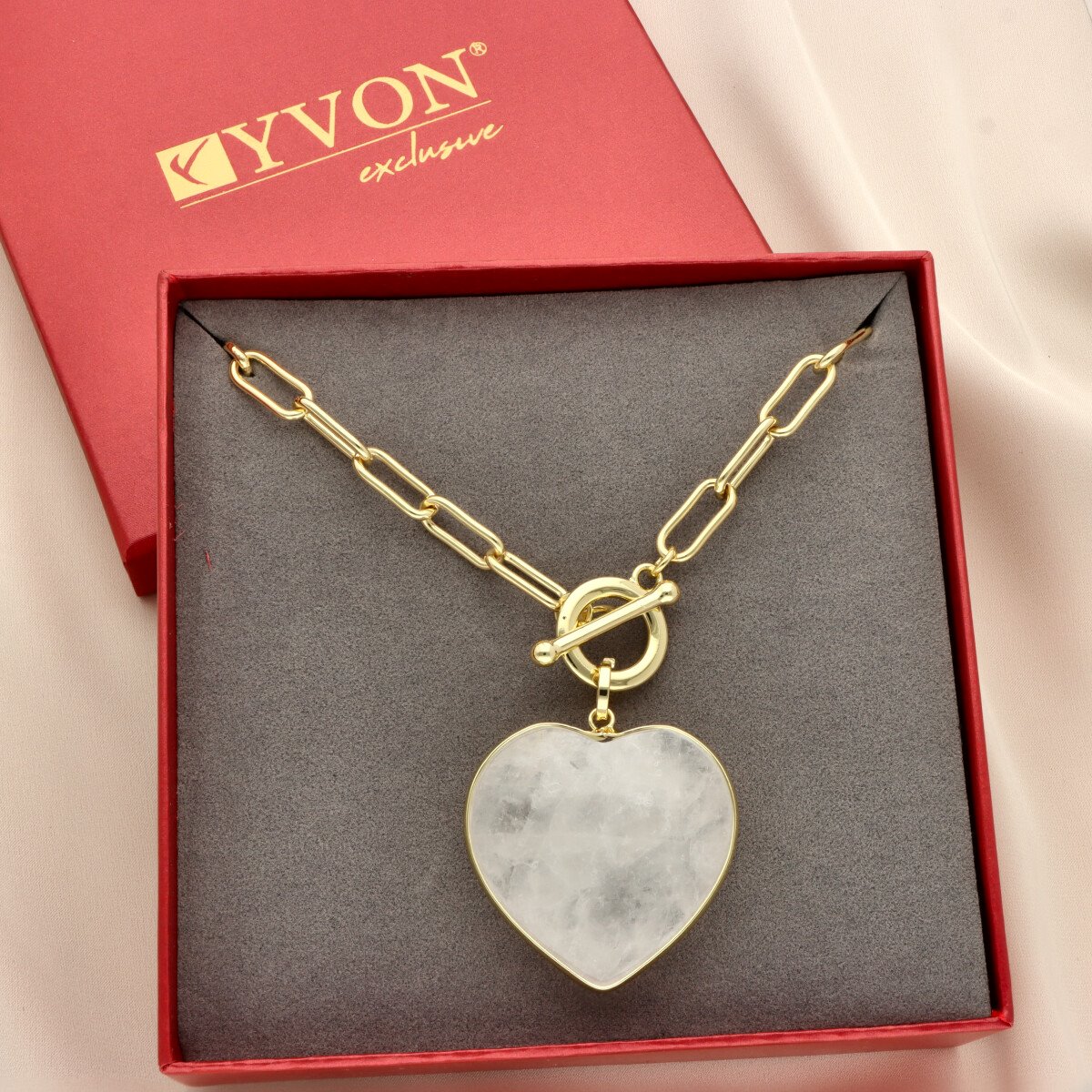 Elegancki, dekoltowy naszyjnik z naturalnym jadeitem mlecznym w kształcie serca. Kamień wyróżnia się subtelną, kremowo-białą barwą z delikatnym, półtransparentnym efektem, który nadaje całości lekkości i szlachetnego charakteru.