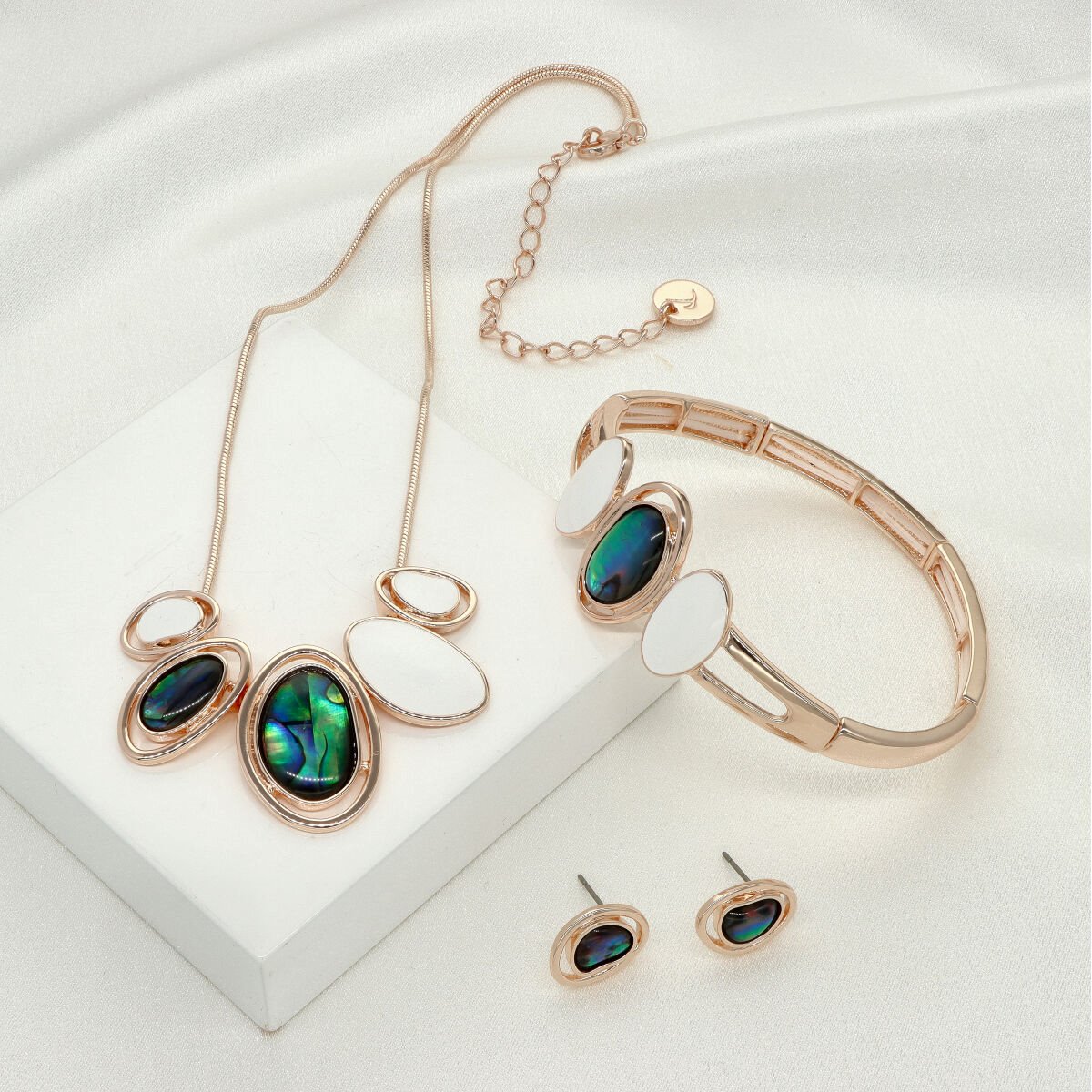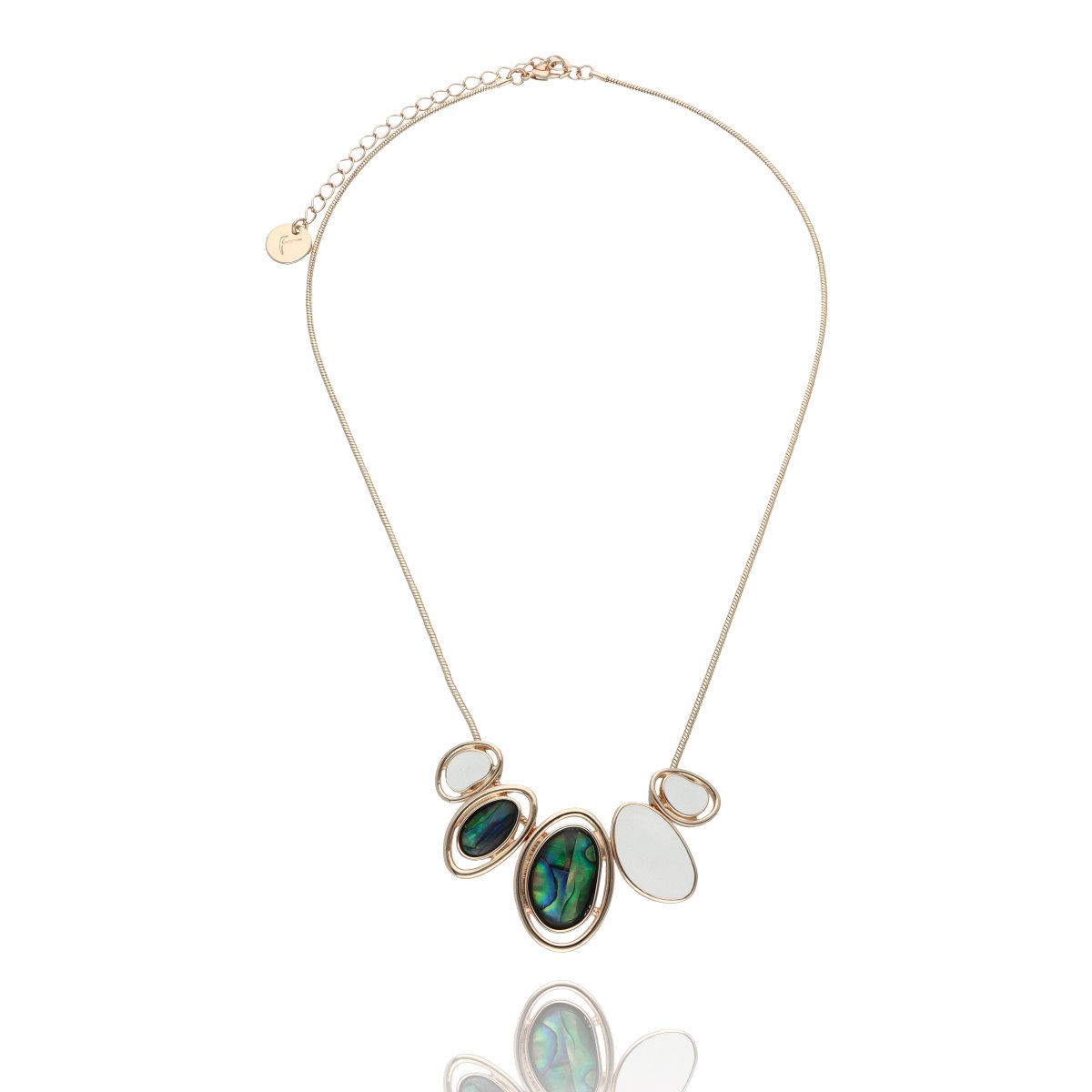 Elegancki dekoldowy naszyjnik wykonany z antyalergicznego metalu, kolorowej emalii i muszli naturalnej Abalone. Długość 42 cm + regulacja. Szukaj do kompletu bransoletki i kolczyków o tym samym indeksie numerycznym.