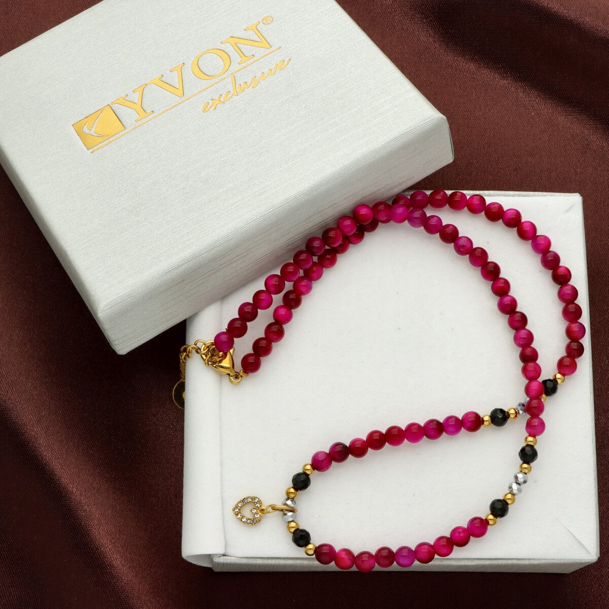 Zjawiskowy naszyjnik wykonany z pozłacanej stali szlachetnej, różowego tygrysiego oka i agatu. Połączenie elegancji z subtelną energią kamieni sprawia, że naszyjnik idealnie dopełnia zarówno codzienne, jak i wieczorowe stylizacje. Długość 40 cm + 5 cm regulacji umożliwia dopasowanie do różnych dekoltów.