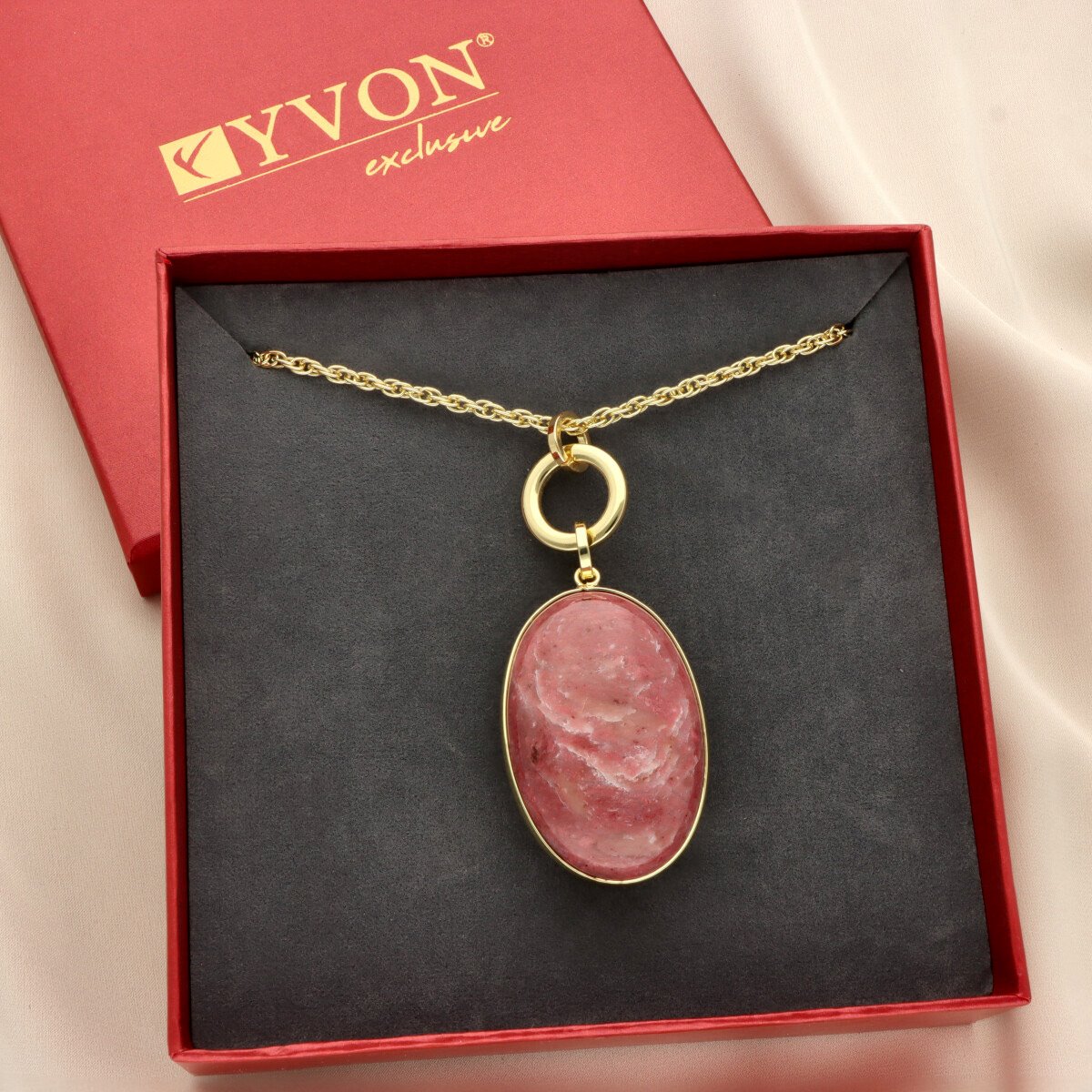 Elegancki, długi naszyjnik z naturalnym kamieniem rodonit w owalnym kształcie. Kamień wyróżnia się subtelną, różowo-malinową kolorystyką z naturalnymi przejściami i delikatnym połyskiem, który nadaje całości wyrafinowanego i kobiecego charakteru.