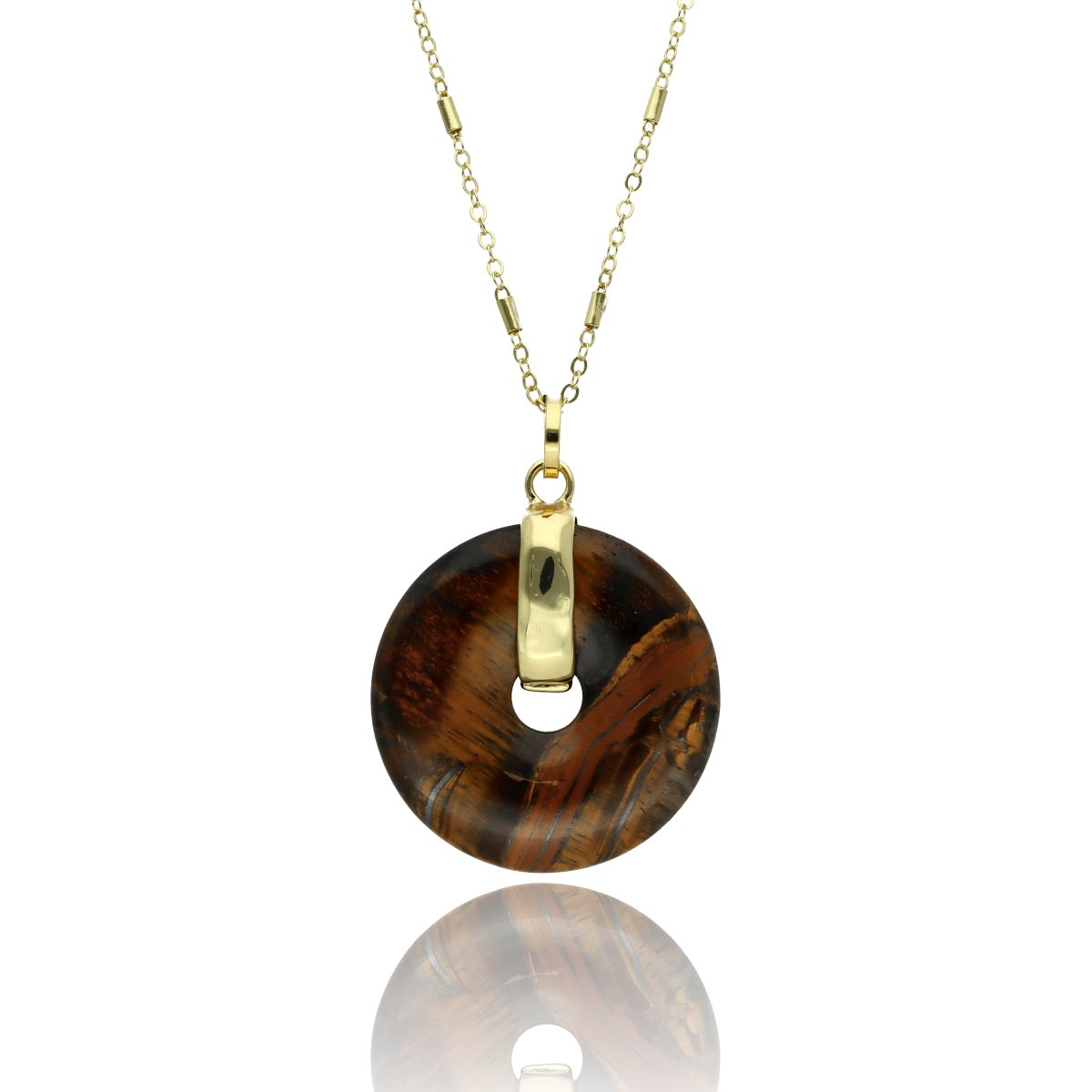Elegancki naszyjnik z naturalnym kamieniem tygrysie oko (Tiger Eye) w formie efektownej, okrągłej zawieszki. Kamień wyróżnia się głęboką, złoto-brązową kolorystyką z charakterystycznym, jedwabistym połyskiem i refleksami światła.