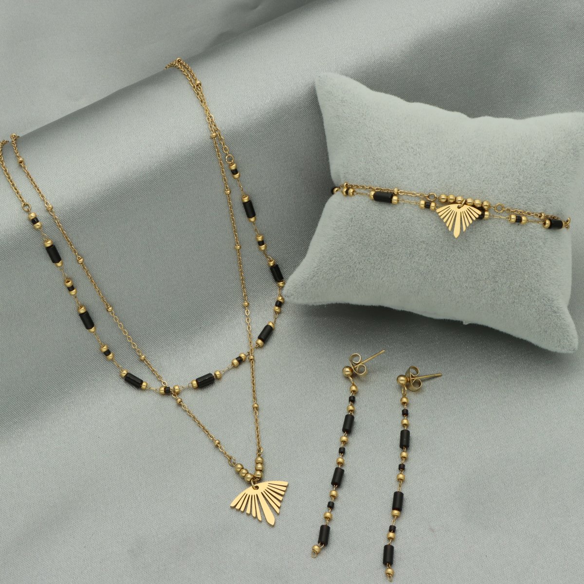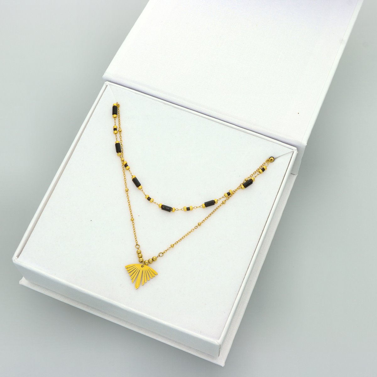 Uroczy naszyjnik z kamieniami naturalnymi w eleganckim pudełeczku. Biżuteria antyalergiczna: stal szlachetna 316L. Kamień naturalny: agat. Pozłacany 16K