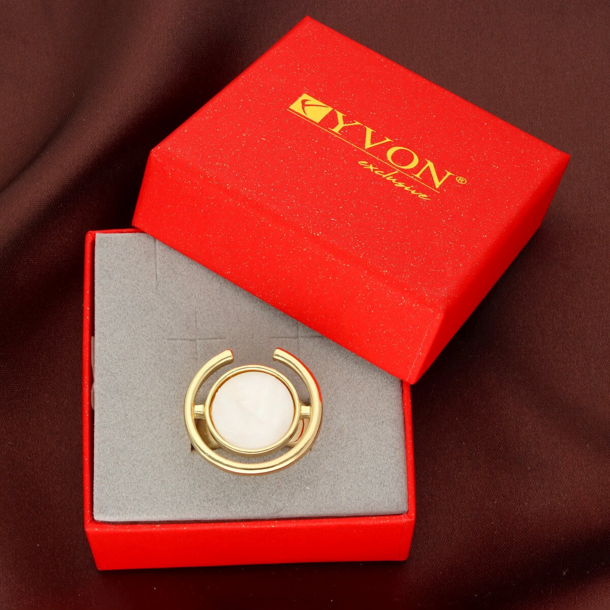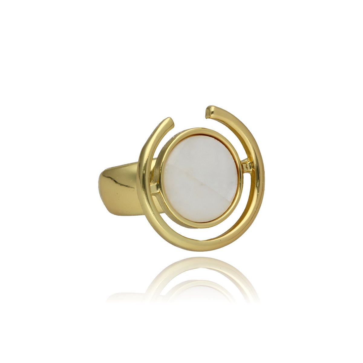 Elegancki pierścionek / damski sygnet wykonany z metalu antyalergicznego – bezpieczny nawet dla wrażliwej skóry, ozdobiony naturalną muszlą mleczną.