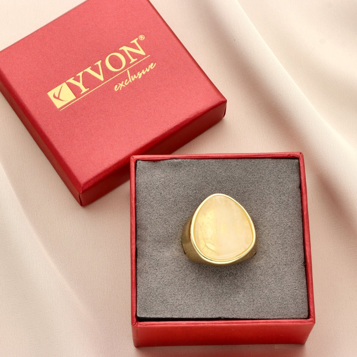 Wyrazisty pierścionek z naturalnym jadeitem mlecznym to elegancki akcent całego zestawu. Gładko szlifowany kamień o subtelnym połysku i kremowej, półtransparentnej barwie pięknie komponuje się ze złotą oprawą, tworząc ponadczasową, szlachetną formę.
