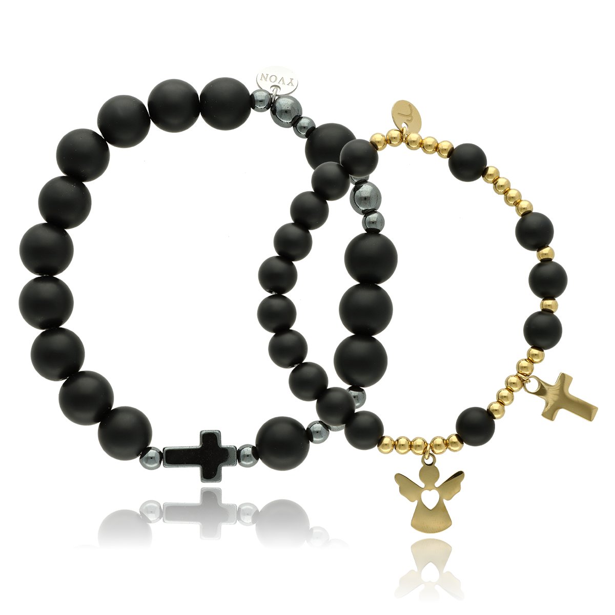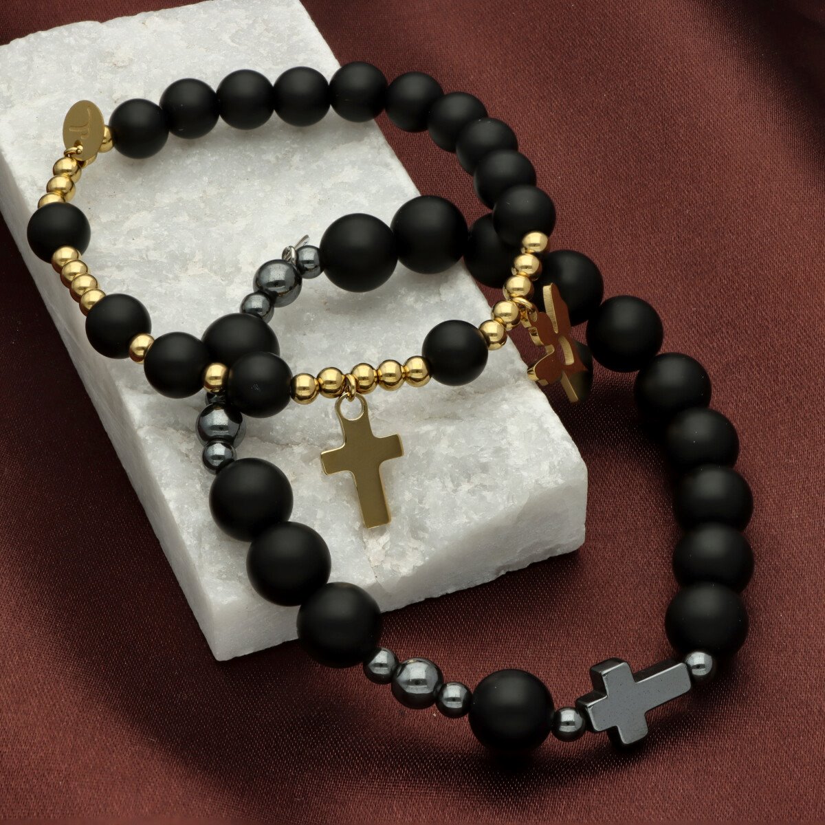 Elegancki zestaw różańców stworzony z myślą o parze — dla niej i dla niego. Wykonany z naturalnych kamieni (oba z AGATU) oraz ze stali szlachetnej 316L, złoconej trwałą metodą PVD, która zapewnia odporność powłoki i piękny wygląd przez długi czas.
