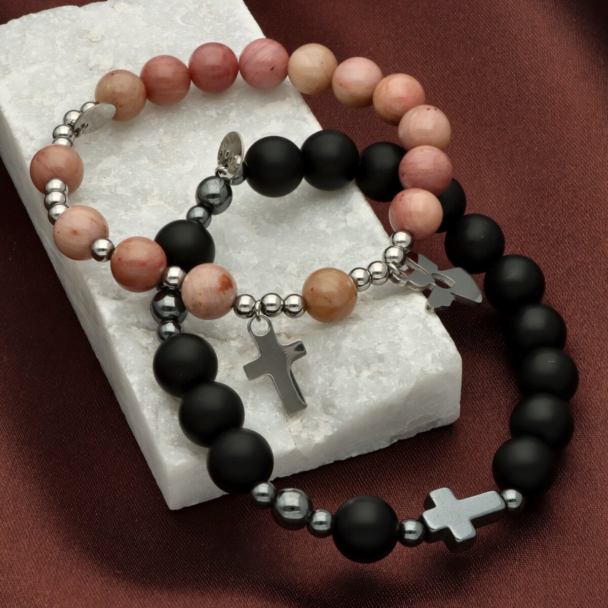 Elegancki zestaw różańców stworzony z myślą o parze — dla niej i dla niego. Wykonany z naturalnych kamieni oraz ze stali szlachetnej 316L, złoconej trwałą metodą PVD, która zapewnia odporność powłoki i piękny wygląd przez długi czas.