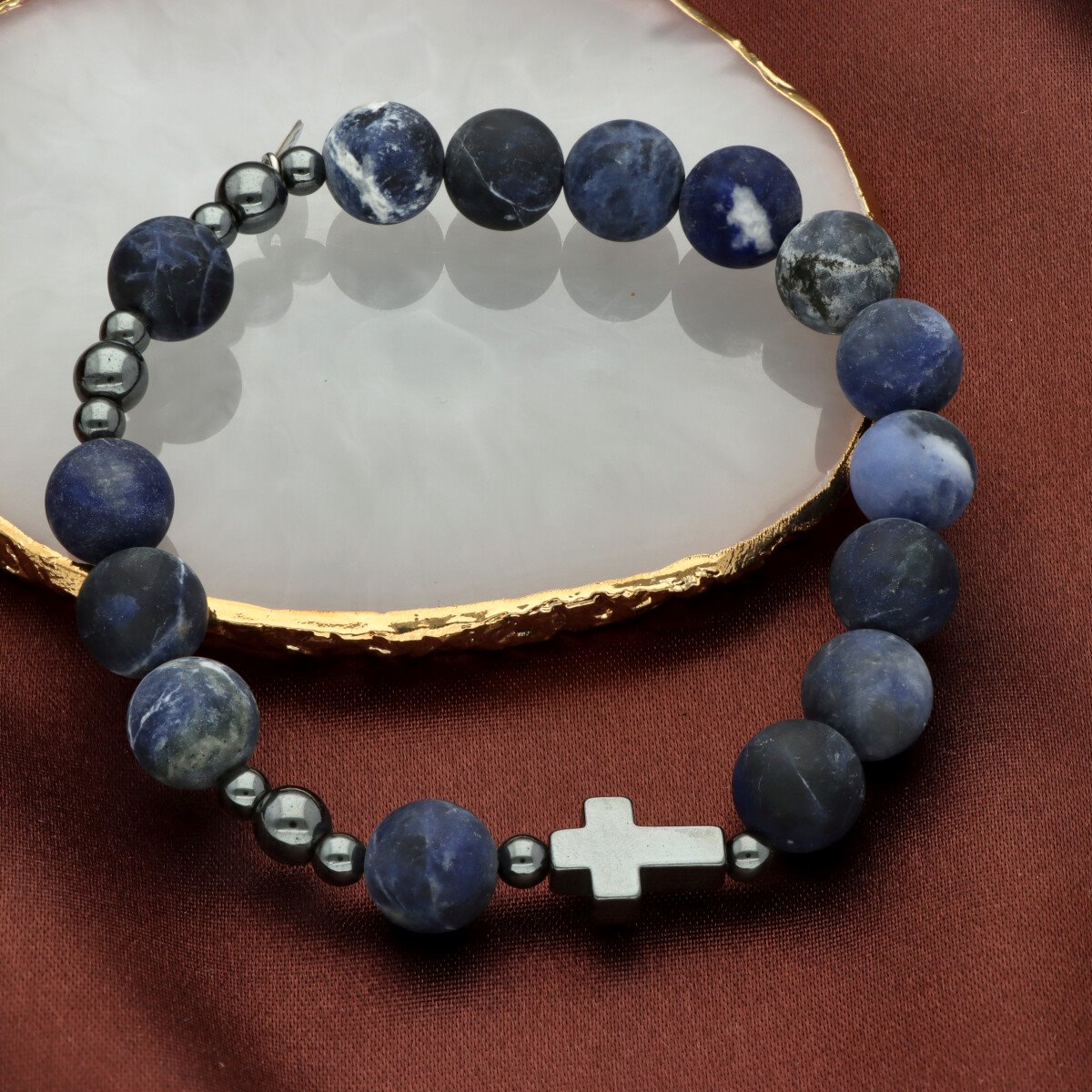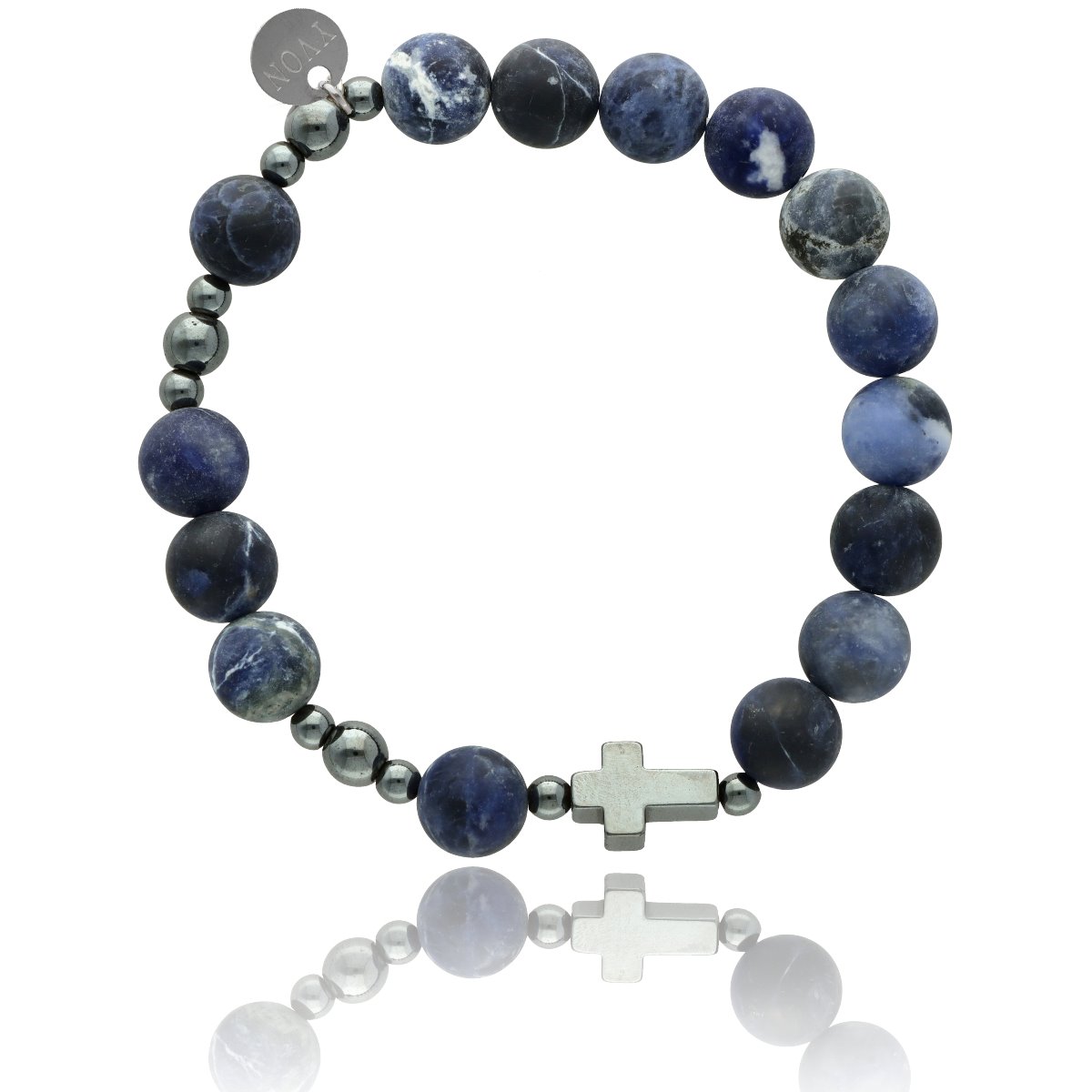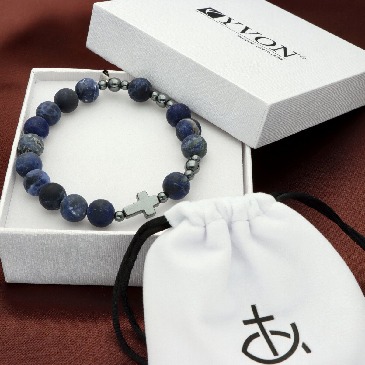 Różaniec na rękę męski, wykonany ze stali szlachetnej i kamieni naturalnych (hematyt, sodalit matowy). Wielkość kamieni: 10 mm Zestaw w eleganckim pudełku i z sakiewką GRATIS.