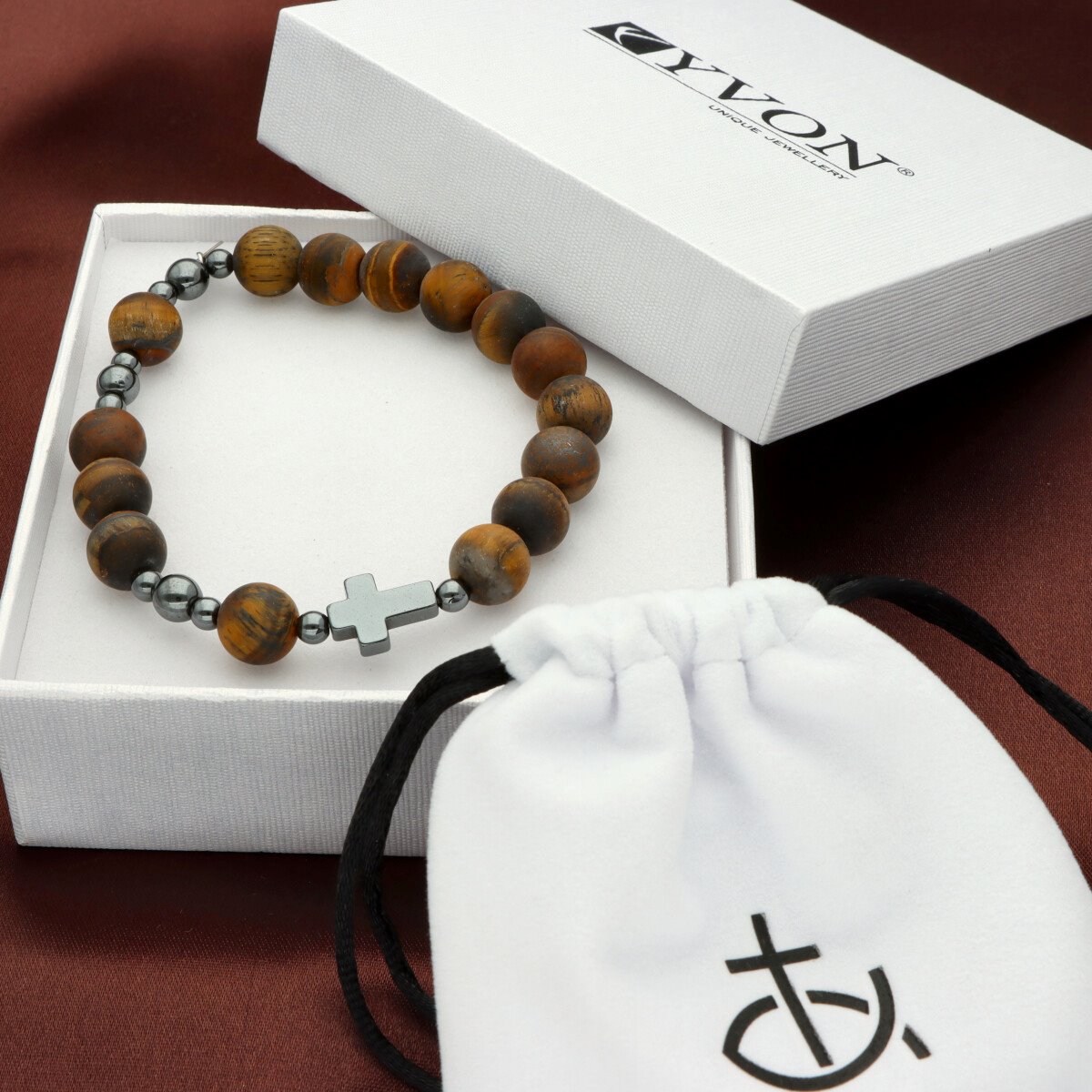 Różaniec na rękę męski, wykonany ze stali szlachetnej i kamieni naturalnych (tygrysie oko matowe). Wielkość kamieni: 10 mm Zestaw w eleganckim pudełku i z sakiewką GRATIS.