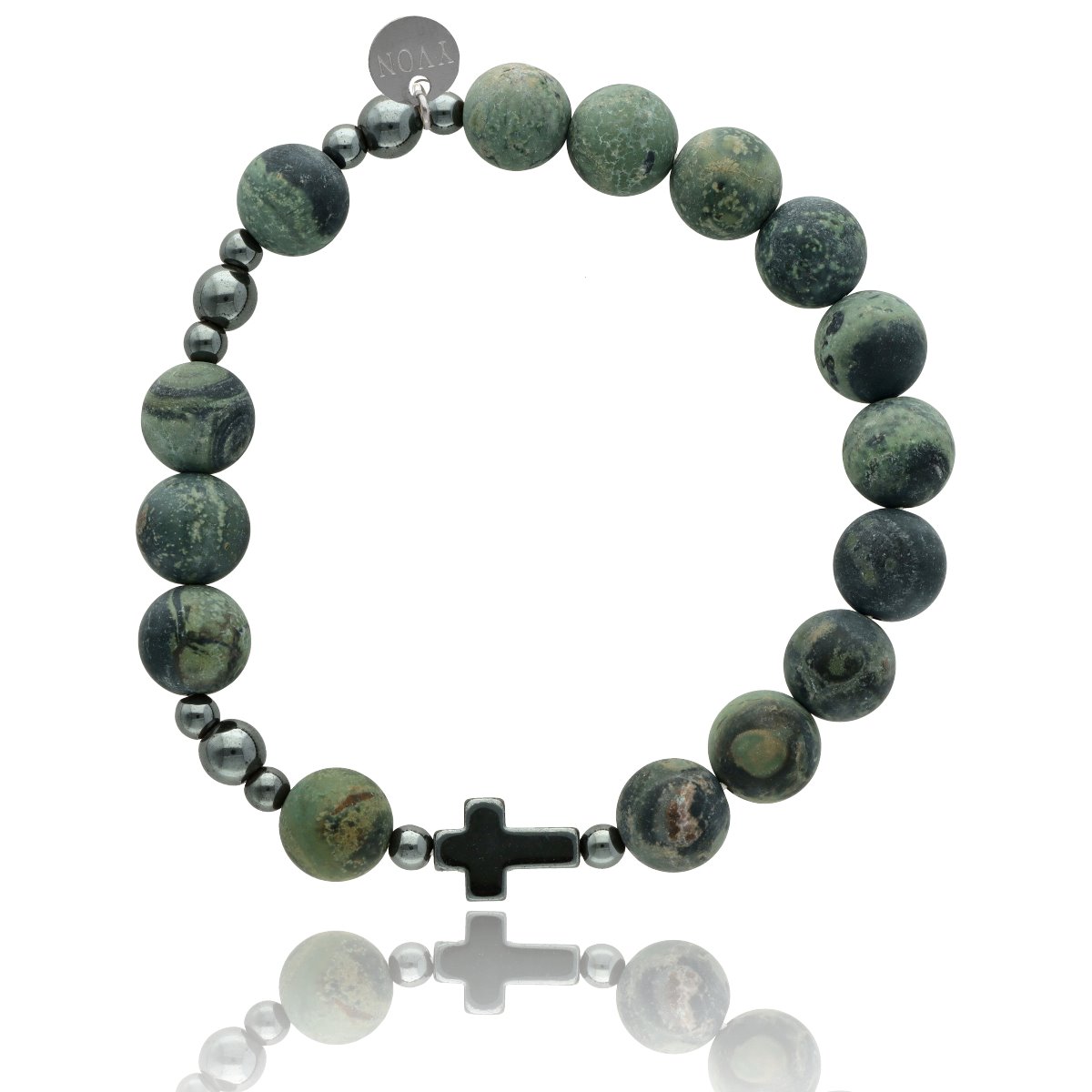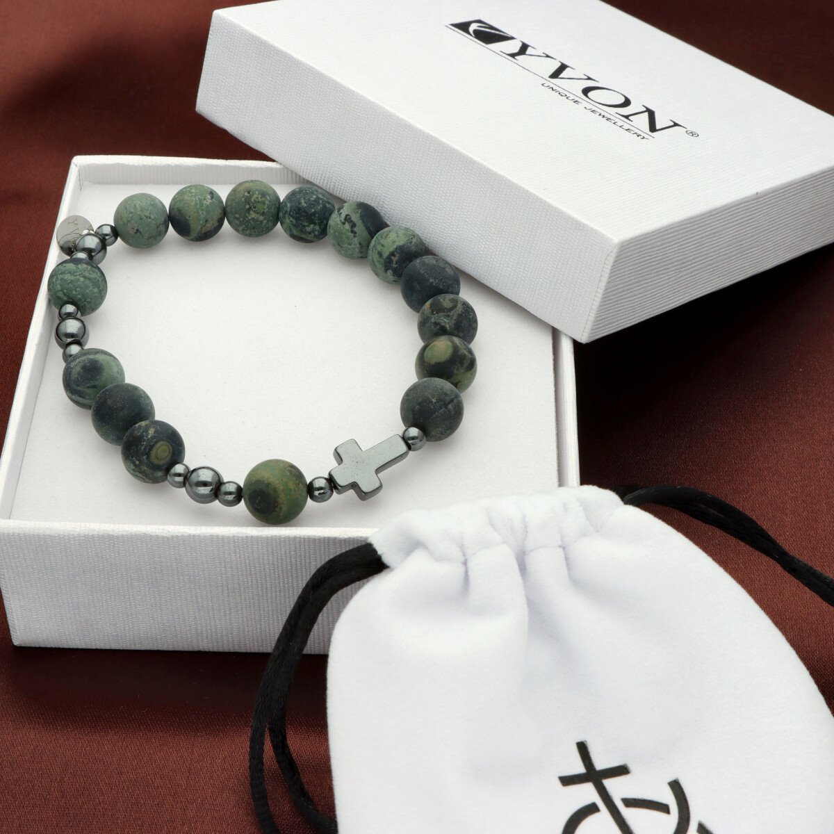 Różaniec na rękę męski, wykonany ze stali szlachetnej i kamieni naturalnych (hematyt, jaspis zielony Kambaba). Wielkość kamieni: 10 mm Zestaw w eleganckim pudełku i z sakiewką GRATIS.