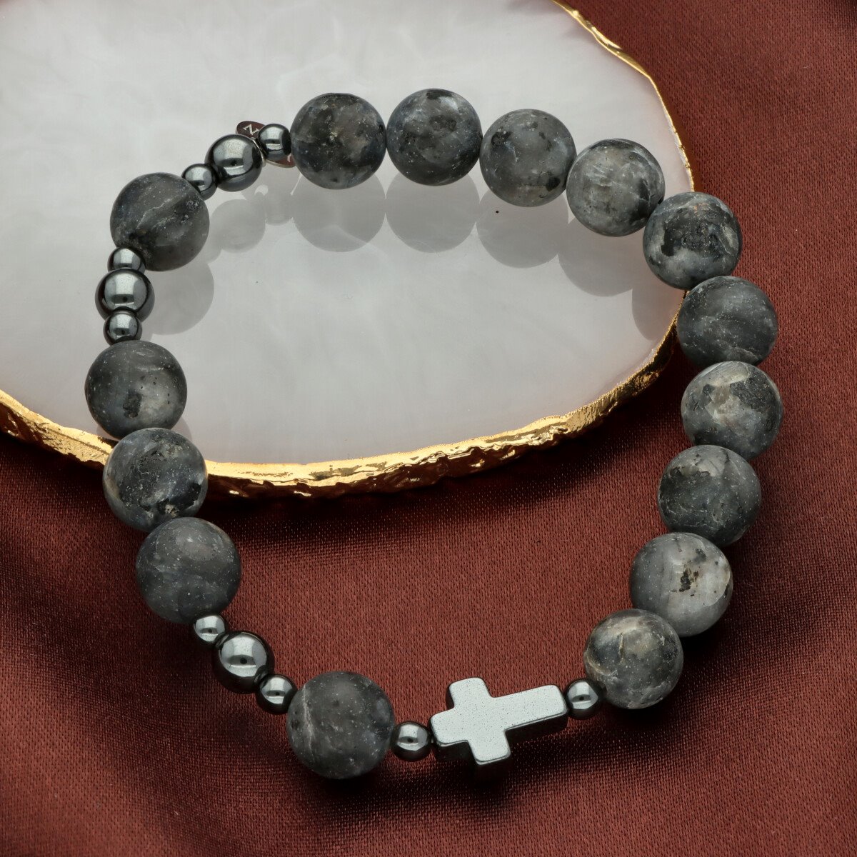 Różaniec na rękę męski, wykonany ze stali szlachetnej i kamieni naturalnych (hematyt, labradoryt). Wielkość kamieni: 10 mm Zestaw w eleganckim pudełku i z sakiewką GRATIS.