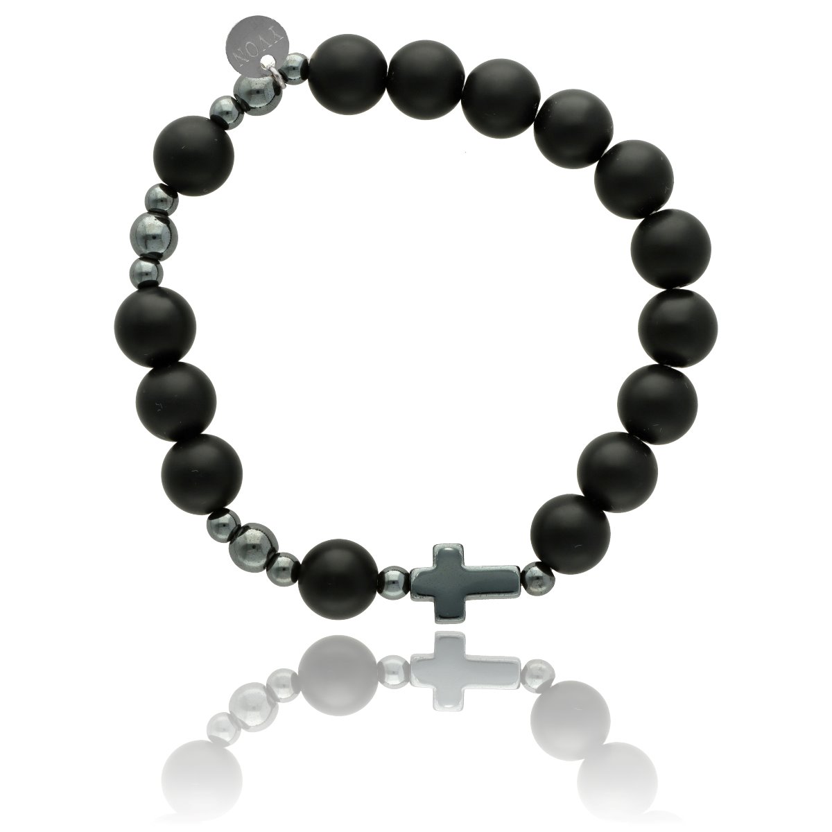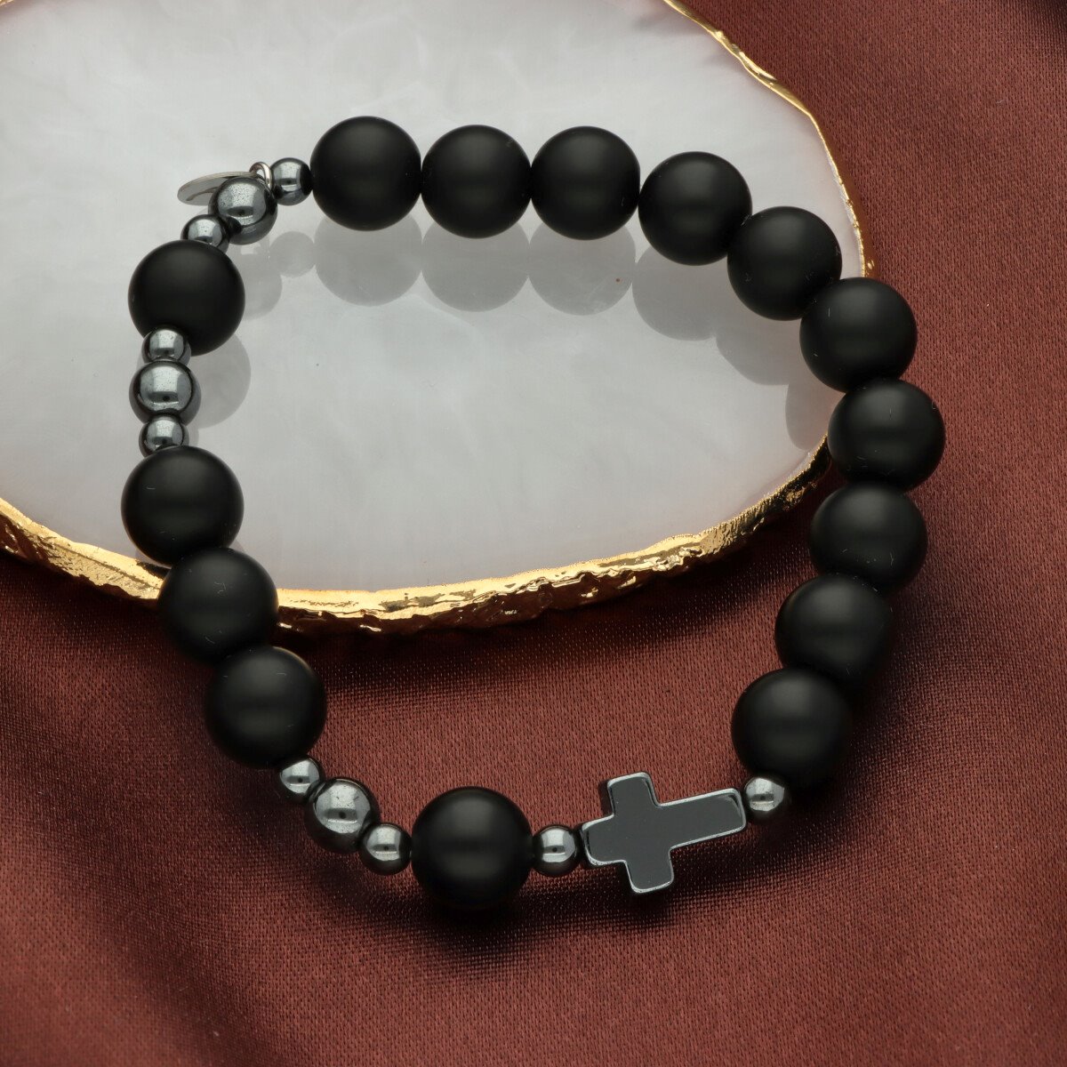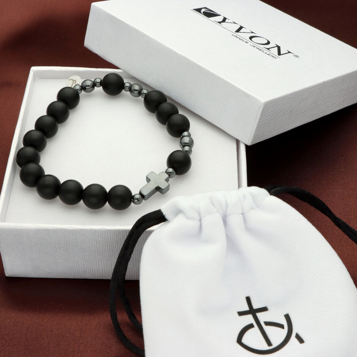 Różaniec na rękę męski, wykonany ze stali szlachetnej i kamieni naturalnych (agat czarny matowy). Wielkość kamieni: 10 mm Zestaw w eleganckim pudełku i z sakiewką GRATIS.