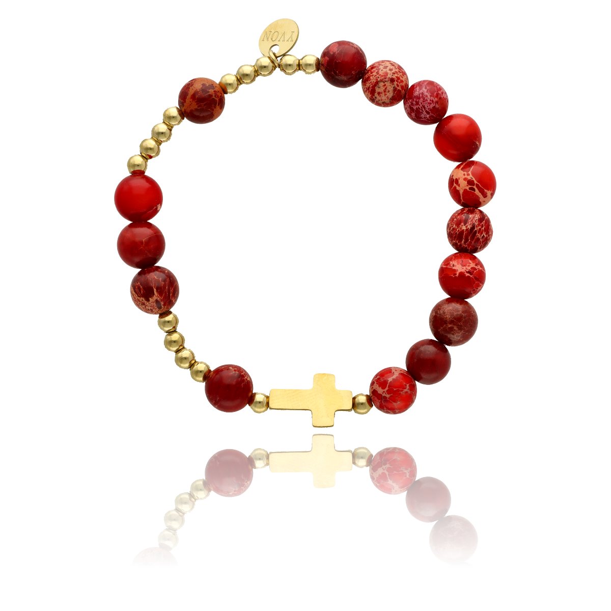 Różaniec na rękę damski, wykonany ze stali szlachetnej złoconej i kamieni naturalnych (jaspis cesaski czerwon). Wielkość kamieni: 8 mm Zestaw w eleganckim pudełku i z sakiewką GRATIS. Idealny pomysł na Komunię Świętą.