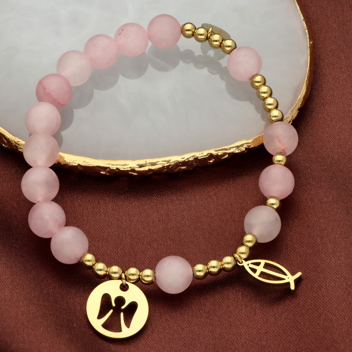 Różaniec na rękę damski, wykonany ze stali szlachetnej złoconej i kamieni naturalnych (jadeit matowy różowy). Wielkość kamieni: 8 mm Zestaw w eleganckim pudełku i z sakiewką GRATIS. Idealny pomysł na Komunię Świętą.