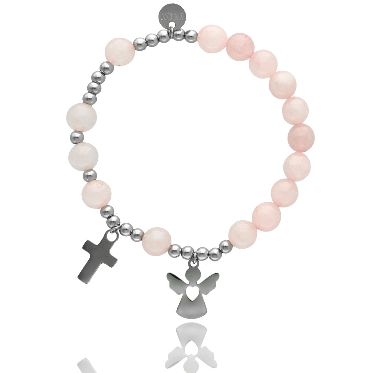 Różaniec na rękę damski, wykonany ze stali szlachetnej złoconej i kamieni naturalnych (jadeit różowy). Wielkość kamieni: 8 mm Zestaw w eleganckim pudełku i z sakiewką GRATIS. Idealny pomysł na Komunię Świętą.