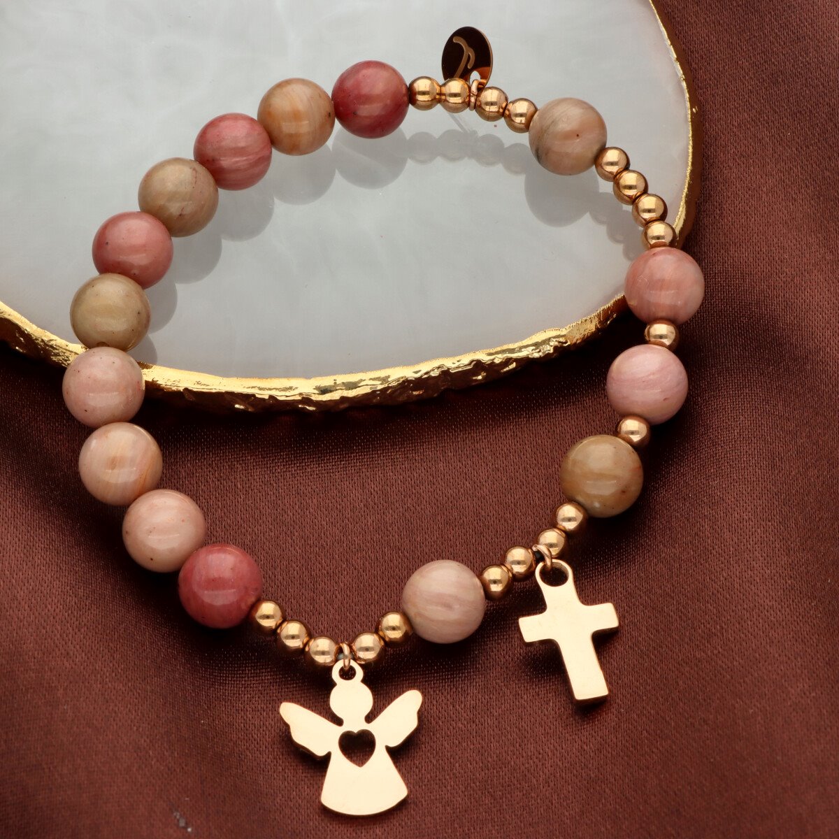 Różaniec na rękę damski, wykonany ze stali szlachetnej złoconej i kamieni naturalnych (rodochrozyt). Wielkość kamieni: 8 mm Zestaw w eleganckim pudełku i z sakiewką GRATIS. Idealny pomysł na Komunię Świętą.