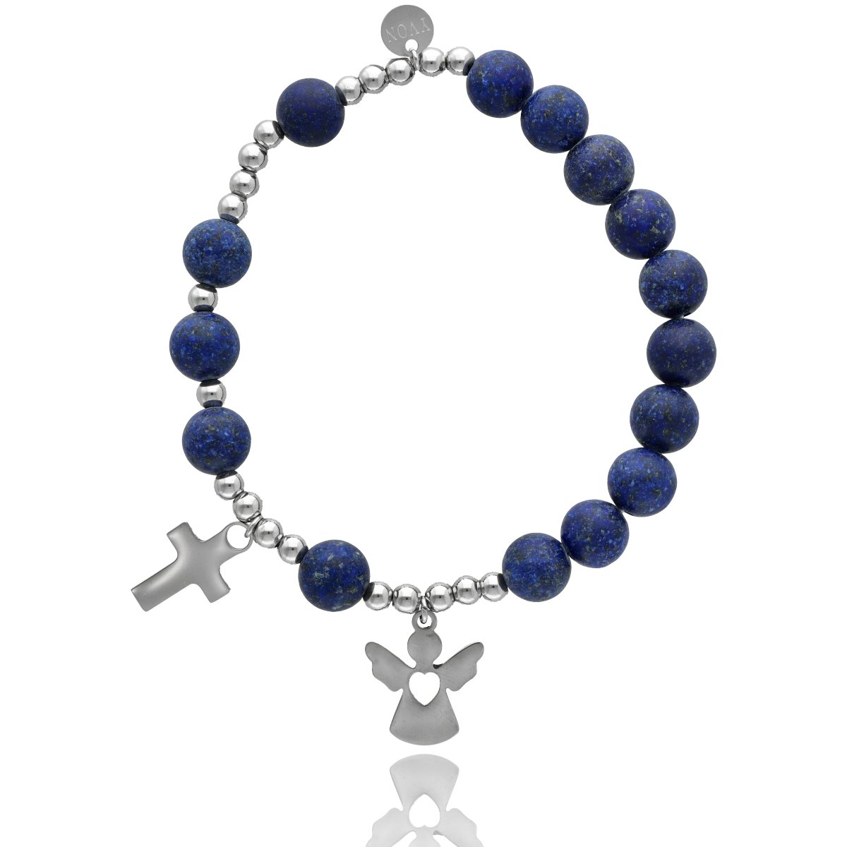 Różaniec na rękę damski, wykonany ze stali szlachetnej złoconej i kamieni naturalnych (jadeit granatowy). Wielkość kamieni: 8 mm Zestaw w eleganckim pudełku i z sakiewką GRATIS. Idealny pomysł na Komunię Świętą.