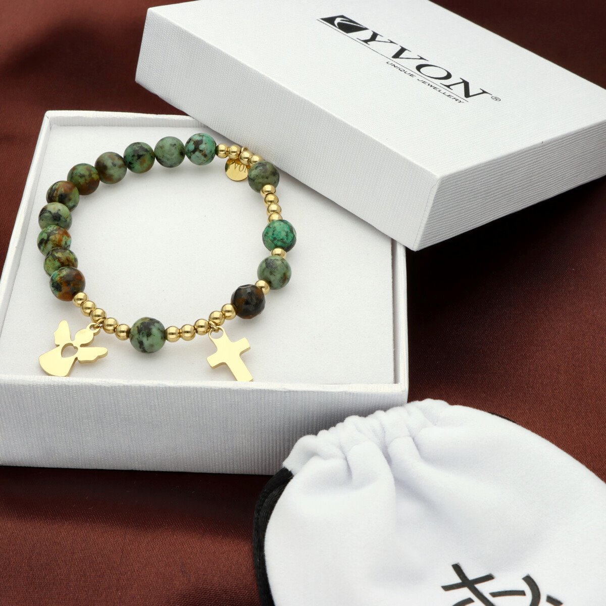 Różaniec na rękę damski, wykonany ze stali szlachetnej złoconej i kamieni naturalnych (turkus afrykański).