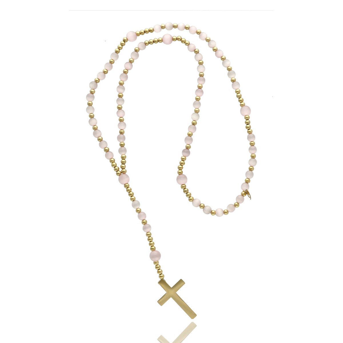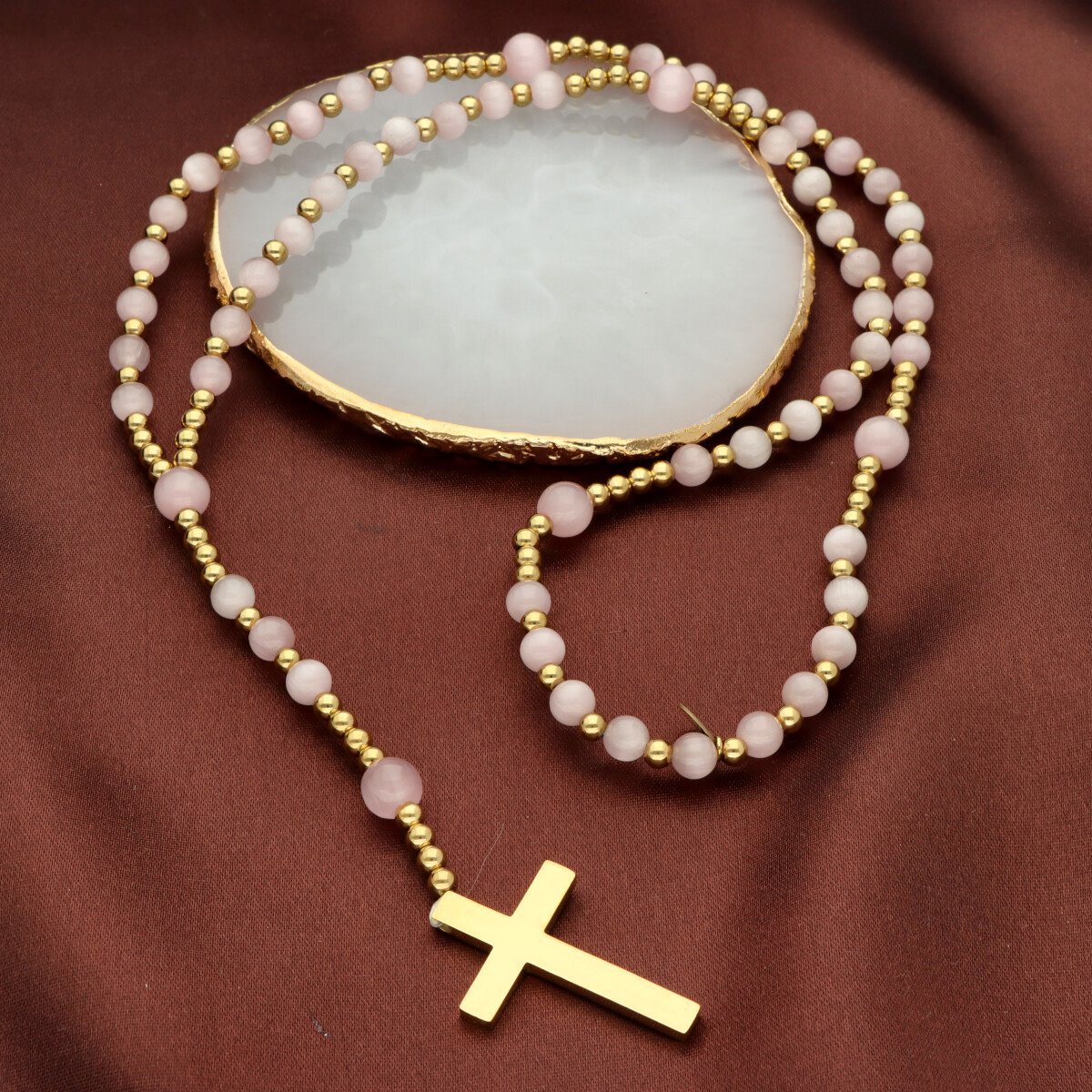 Różaniec wykonany ze stali szlachetnej złoconej i kamieni naturalnych (kocie oko różowe). Wielkość kamieni: 6 i 8 mm Zestaw w eleganckim pudełku i z sakiewką GRATIS. Idealny pomysł na Komunię Świętą.