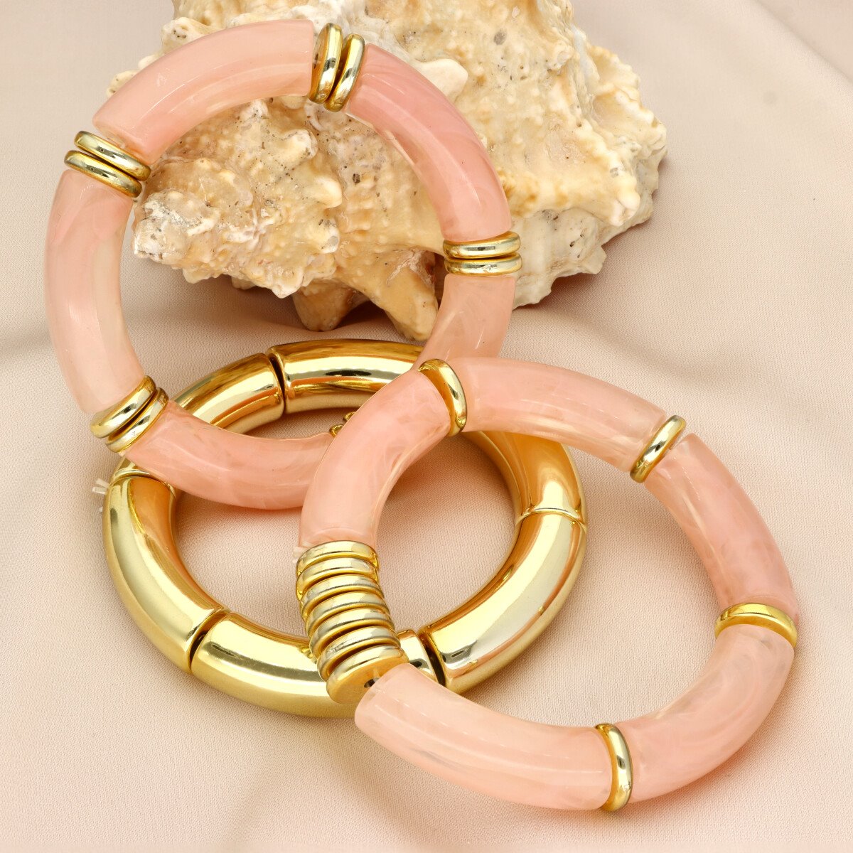 Zestawy bransolet YVON to wyraz nowoczesnej elegancji w wyjątkowo dopracowanej formie. Połączenie gładkiego, złotego metalu z dekoracyjną żywicą o subtelnym, marmurkowym efekcie tworzy kompozycję, która przyciąga uwagę, a jednocześnie pozostaje ponadczasowa. Każdy komplet został zaprojektowany tak, aby tworzyć spójną, stylową całość – różnorodność form i faktur nadaje bransoletkom unikatowego charakteru, a stonowana, klasyczna kolorystyka sprawia, że pasują zarówno do codziennych stylizacji, jak i bardziej eleganckich zestawień. Bransoletki wykonane są z metalu hipoalergicznego (zamak) oraz wysokiej jakości żywicy, dzięki czemu są komfortowe w noszeniu i przyjazne dla skóry. Standardowa średnica 6,5 cm zapewnia dobre dopasowanie do nadgarstka. Zestaw obejmuje wszystkie bransoletki widoczne na zdjęciu, tworząc gotową stylizację, która nie wymaga już żadnych dodatków – to biżuteria, która sama buduje cały look i nadaje mu wyrazistości.