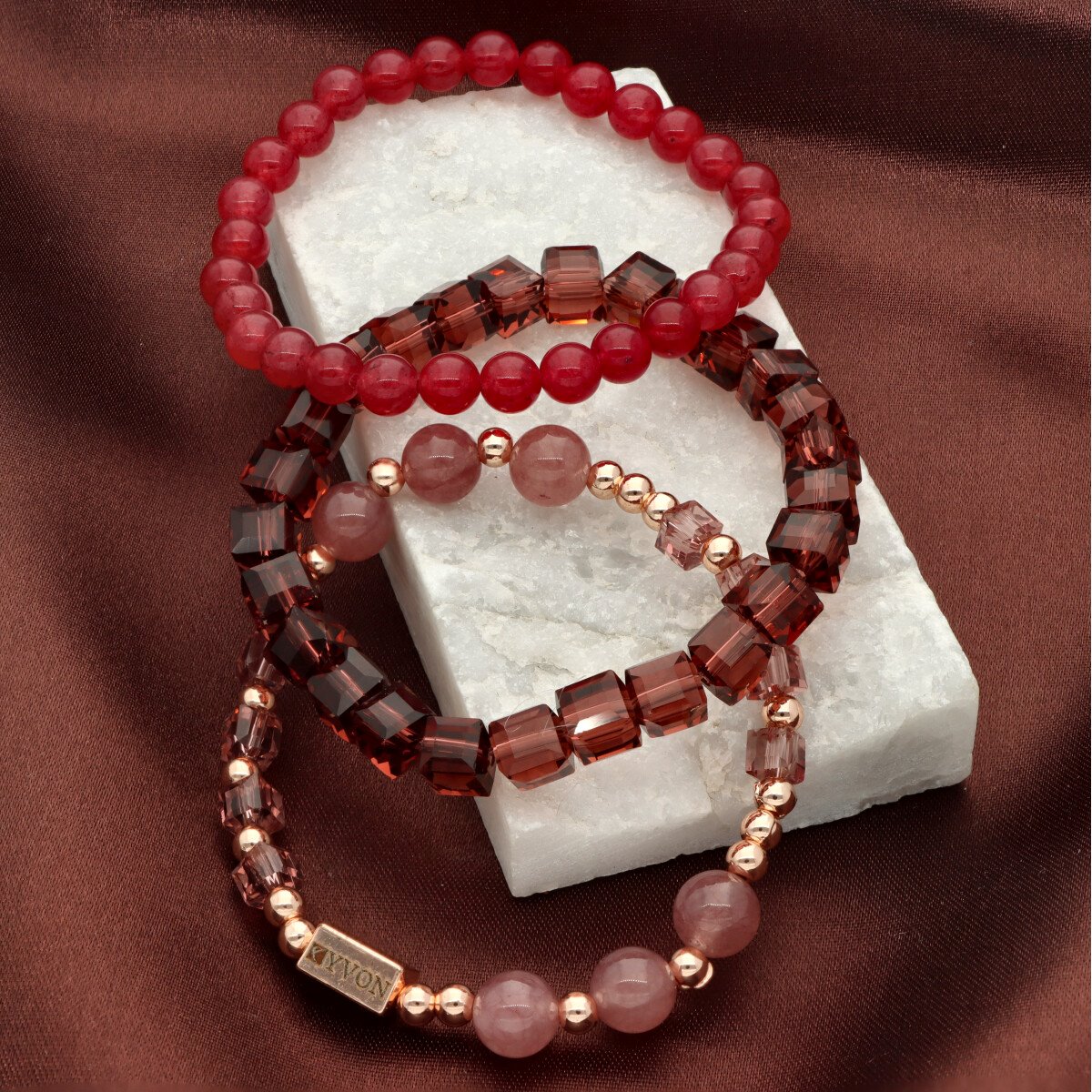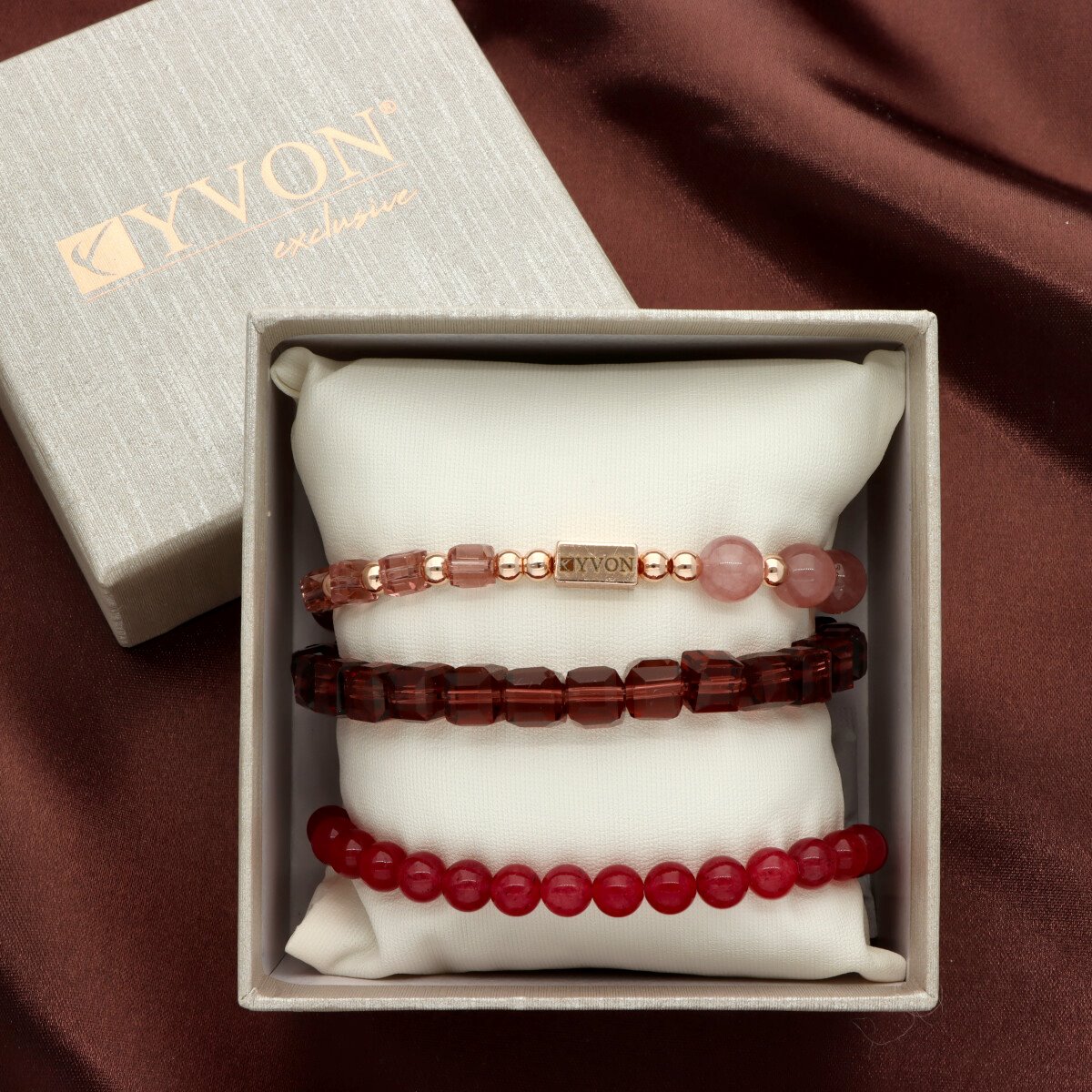 Zestaw trzech bransoletek z KAMIENIAMI NATURALNYMI (GRANAT), który łączy w sobie klasyczną elegancję i najwyższą jakość wykonania. Każdy element został starannie dobrany – od antyalergicznego mosiądzu, przez elementy z kamieni, aż po misternie fasetowane koraliki z kryształu górskiego. Subtelne połączenie tych materiałów tworzy niepowtarzalny, ponadczasowy dodatek. Bransoletki zapakowane są w eleganckie pudełeczko z miękką poduszeczką, co sprawia, że zestaw doskonale nadaje się na prezent.
