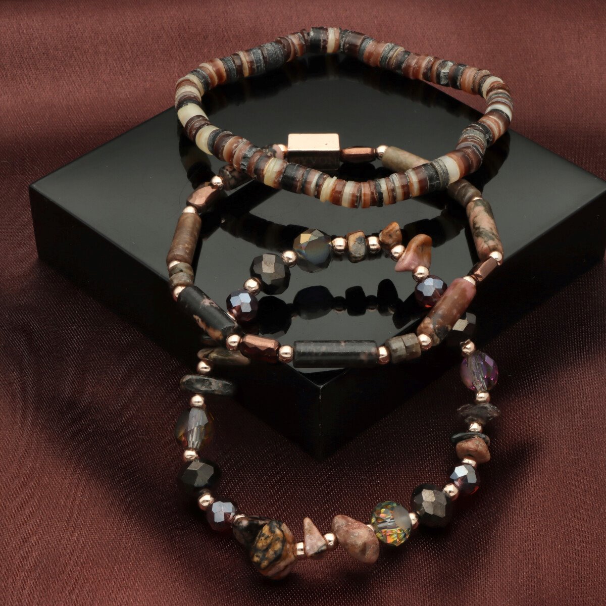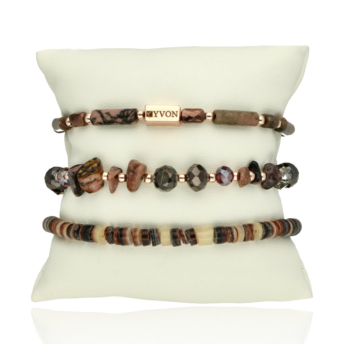 Zestaw trzech bransoletek z KAMIENIAMI NATURALNYMI (rodonit, jaspis leopardzi, muszla), który łączy w sobie klasyczną elegancję i najwyższą jakość wykonania. Każdy element został starannie dobrany – od antyalergicznego mosiądzu, przez elementy z kamieni, aż po misternie fasetowane koraliki z kryształu górskiego. Subtelne połączenie tych materiałów tworzy niepowtarzalny, ponadczasowy dodatek. Bransoletki zapakowane są w eleganckie pudełeczko z miękką poduszeczką, co sprawia, że zestaw doskonale nadaje się na prezent.
