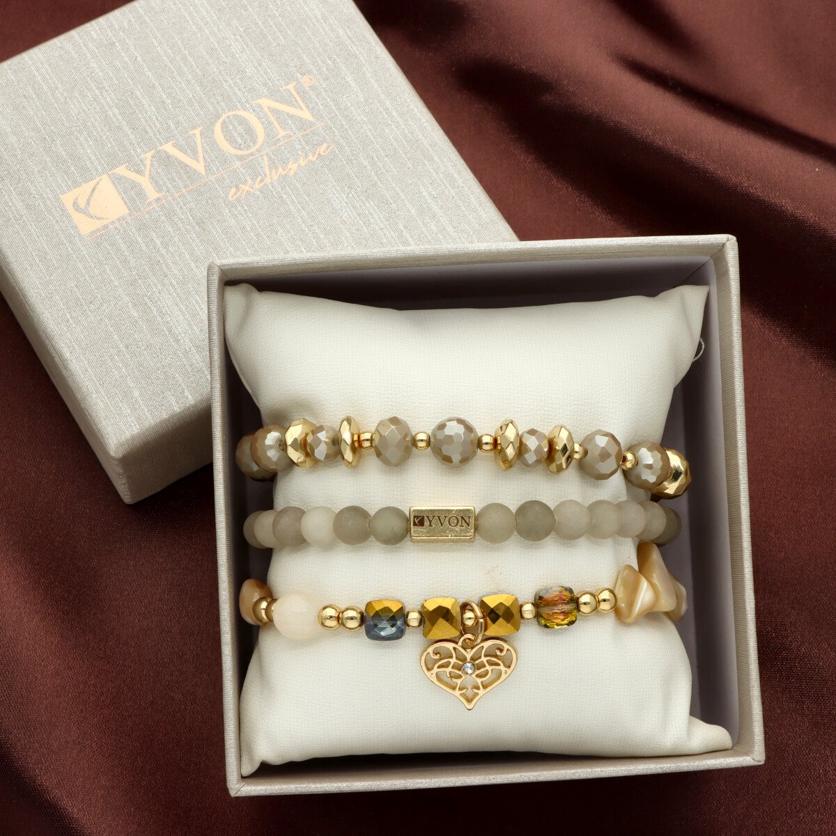 Zestaw trzech bransoletek z KAMIENIAMI NATURALNYMI (kamień księżycowy, muszla), który łączy w sobie klasyczną elegancję i najwyższą jakość wykonania. Każdy element został starannie dobrany – od antyalergicznego mosiądzu, przez elementy z kamieni, aż po misternie fasetowane koraliki z kryształu górskiego. Subtelne połączenie tych materiałów tworzy niepowtarzalny, ponadczasowy dodatek. Bransoletki zapakowane są w eleganckie pudełeczko z miękką poduszeczką, co sprawia, że zestaw doskonale nadaje się na prezent.