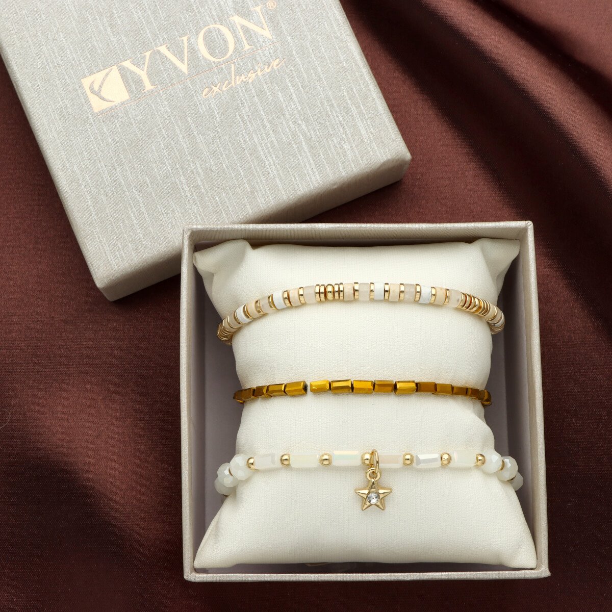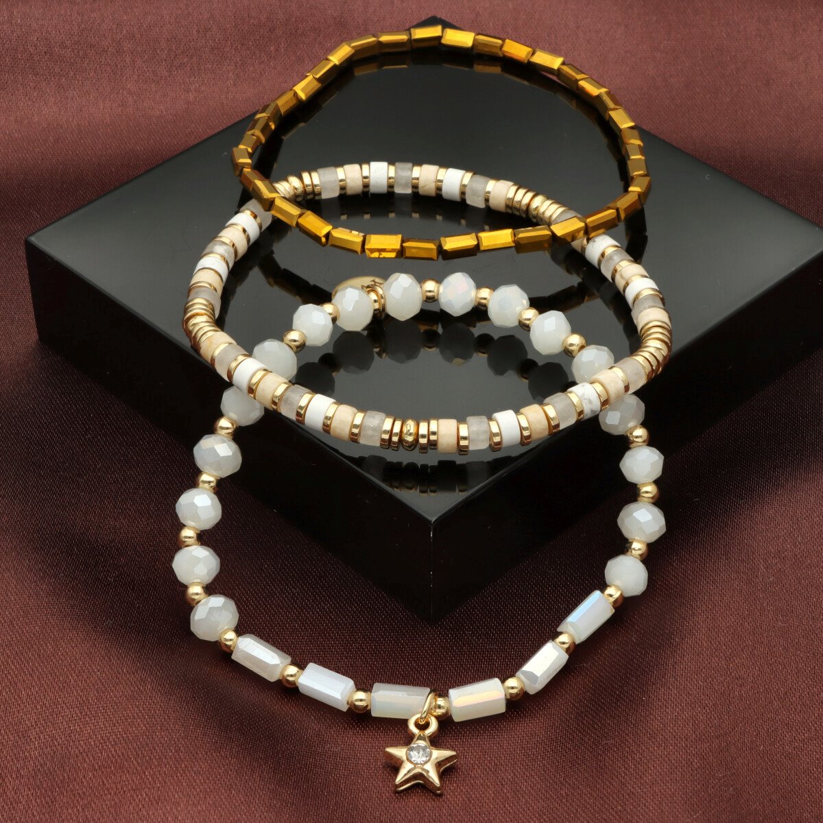 Zestaw trzech bransoletek z KAMIENIAMI NATURALNYMI (agat biały, howlit), który łączy w sobie klasyczną elegancję i najwyższą jakość wykonania. Każdy element został starannie dobrany – od antyalergicznego mosiądzu, przez elementy z kamieni, aż po misternie fasetowane koraliki z kryształu górskiego. Subtelne połączenie tych materiałów tworzy niepowtarzalny, ponadczasowy dodatek.