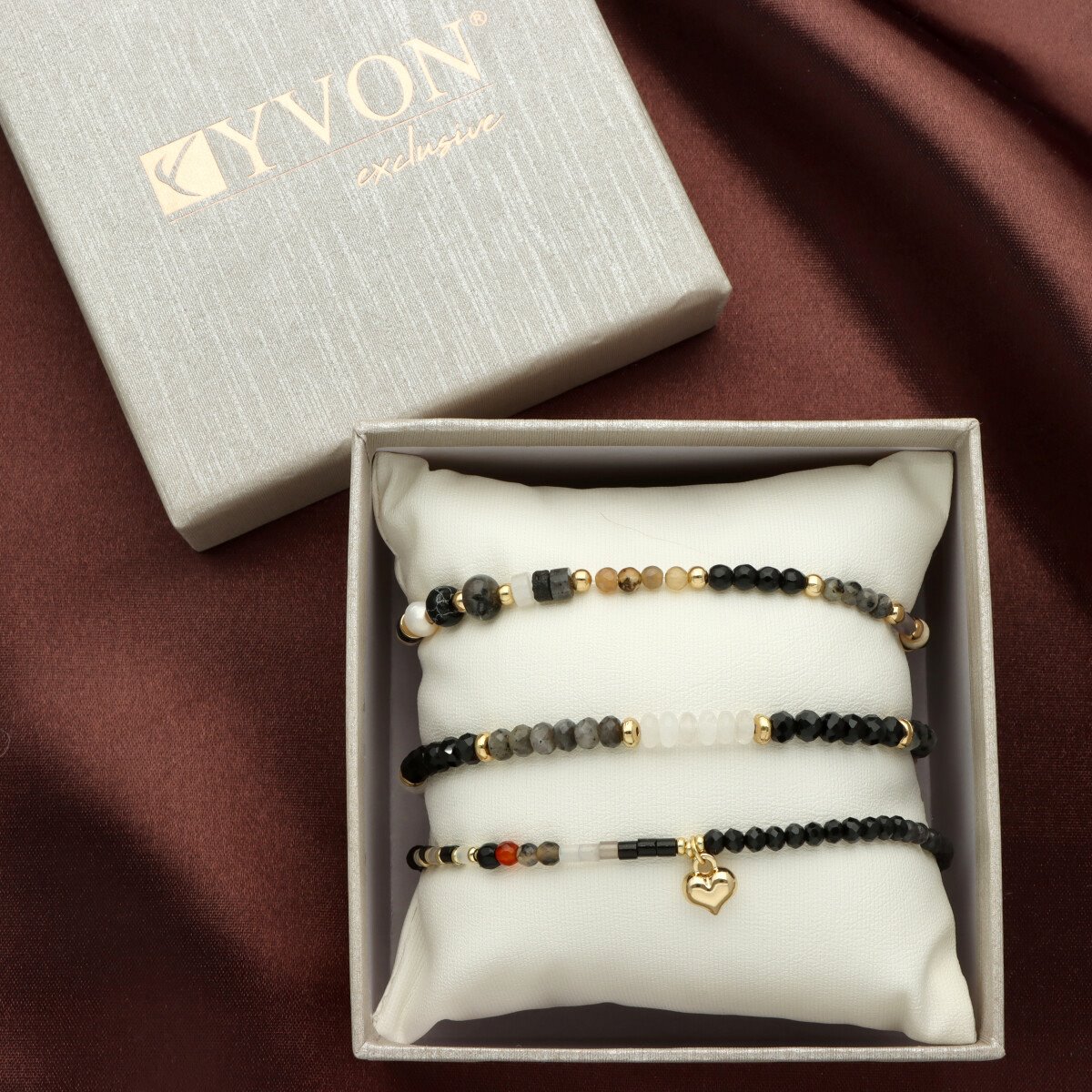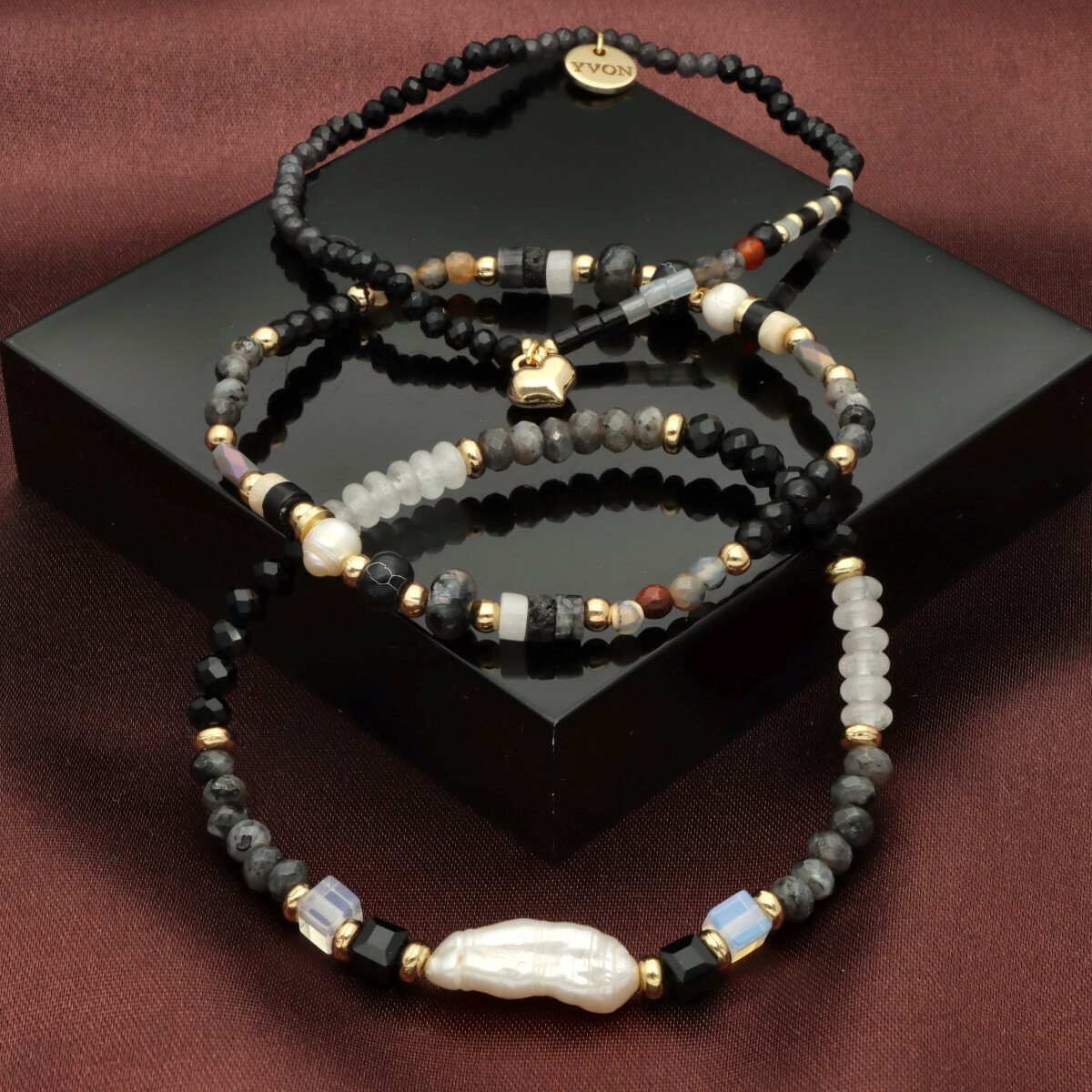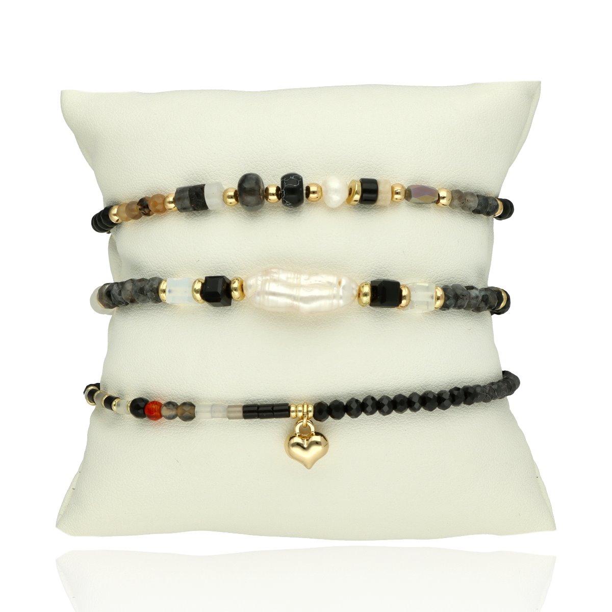 Zestaw trzech bransoletek z KAMIENIAMI NATURALNYMI (agat) i PERŁAMI NATURALNYMI, który łączy w sobie klasyczną elegancję i najwyższą jakość wykonania. Każdy element został starannie dobrany – od antyalergicznego mosiądzu, przez elementy z kamieni i pereł barokowych słodkowodnych, aż po misternie fasetowane koraliki z kryształu górskiego. Subtelne połączenie tych materiałów tworzy niepowtarzalny, ponadczasowy dodatek.