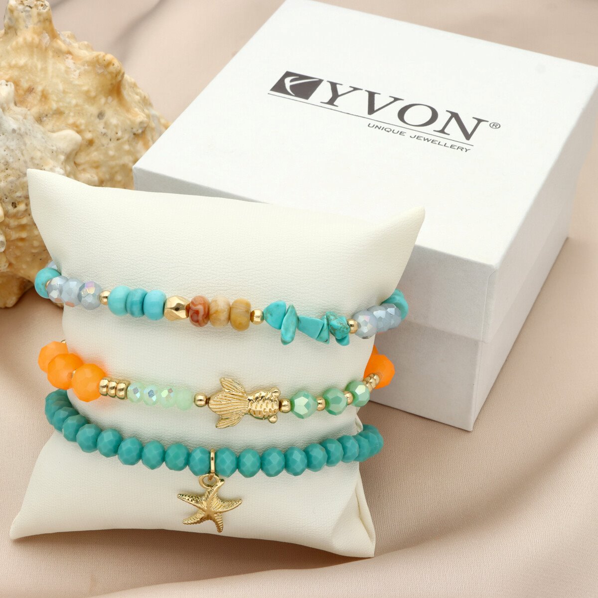 Zestaw trzech bransoletek z hipoalergicznego mosiadzu, szkła kryształowego i KAMIENI NATURALNYCH: turkus, marmur, amazonit.