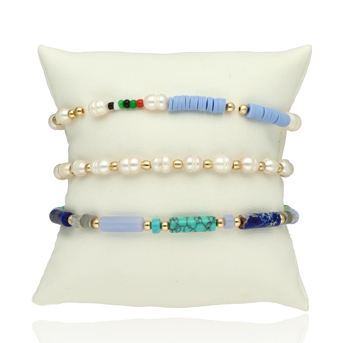 Zestaw trzech bransoletek z hipoalergicznego mosiadzu, z perłami naturalnymi i kamieniami naturalnymi: awenturyn, lapis lazuli oraz ze szkłem kryształowym.