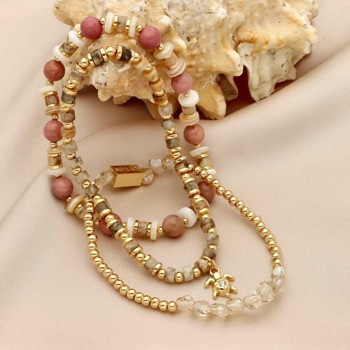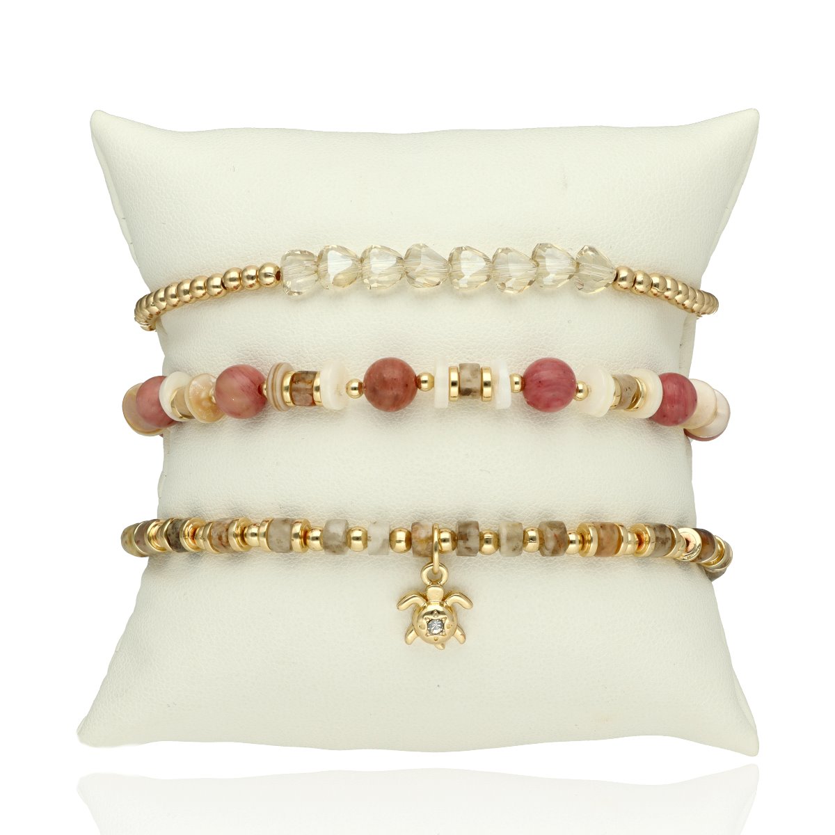 Zestaw trzech bransoletek z hipoalergicznego mosiadzu, szkła kryształowego i KAMIENI NATURALNYCH: jaspis "red wood", muszla naturalna.