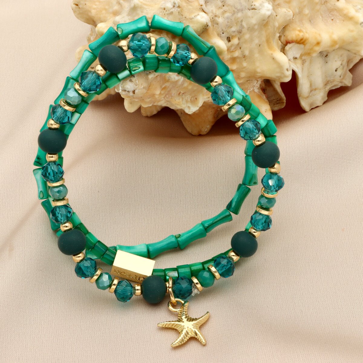 Zestaw trzech bransoletek z hipoalergicznego mosiadzu, szkła kryształowego i muszli naturalnej.