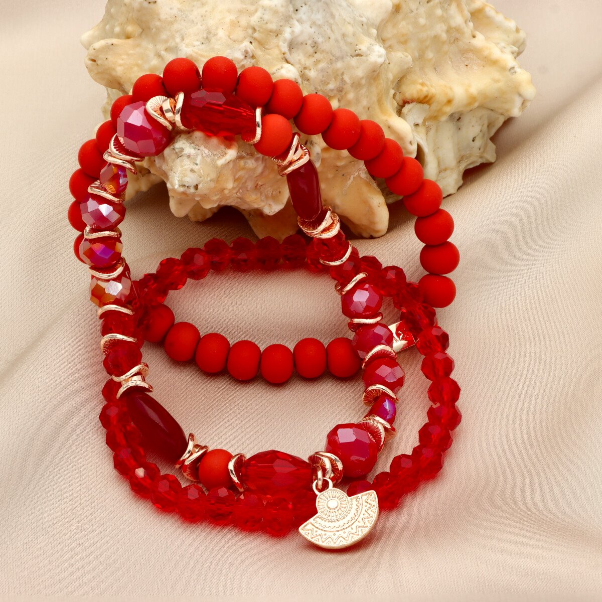 Zestaw trzech bransoletek z hipoalergicznego mosiadzu, szkła kryształowego i KAMIENI NATURALNYCH: kwarc hematoidowy czerwony, oraz kompozytu jubilerskiego.